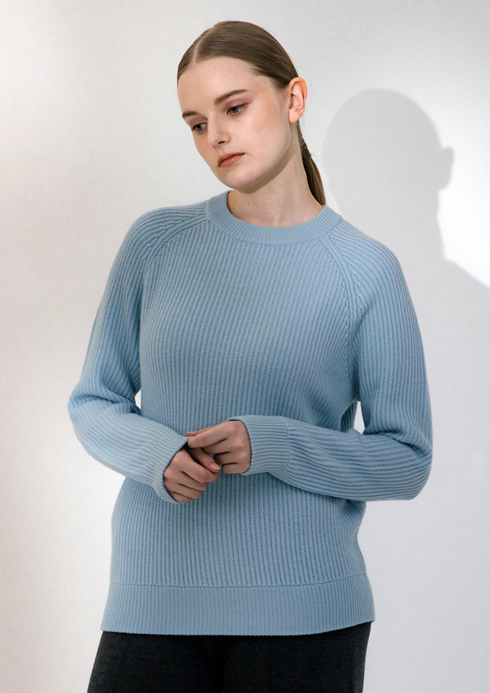 「肌触りの良い柔らかなオーガニックカシミヤをていねいにリブ組織で編み上げたクルーネックニット。自然由来のやさしい素材が生むしなやかなフィット感と、縦ラインのリブが引き立てるすっきりとした大人の表情が魅力です。マキシ丈のスカートとも好相性で、上品な抜け感を演出。環境への配慮を大切にした製造プロセスによって、飽きのこないベーシックアイテムにさらなる価値をプラスしています。心地よくリラックスした休日を、上質な一枚で彩って」。