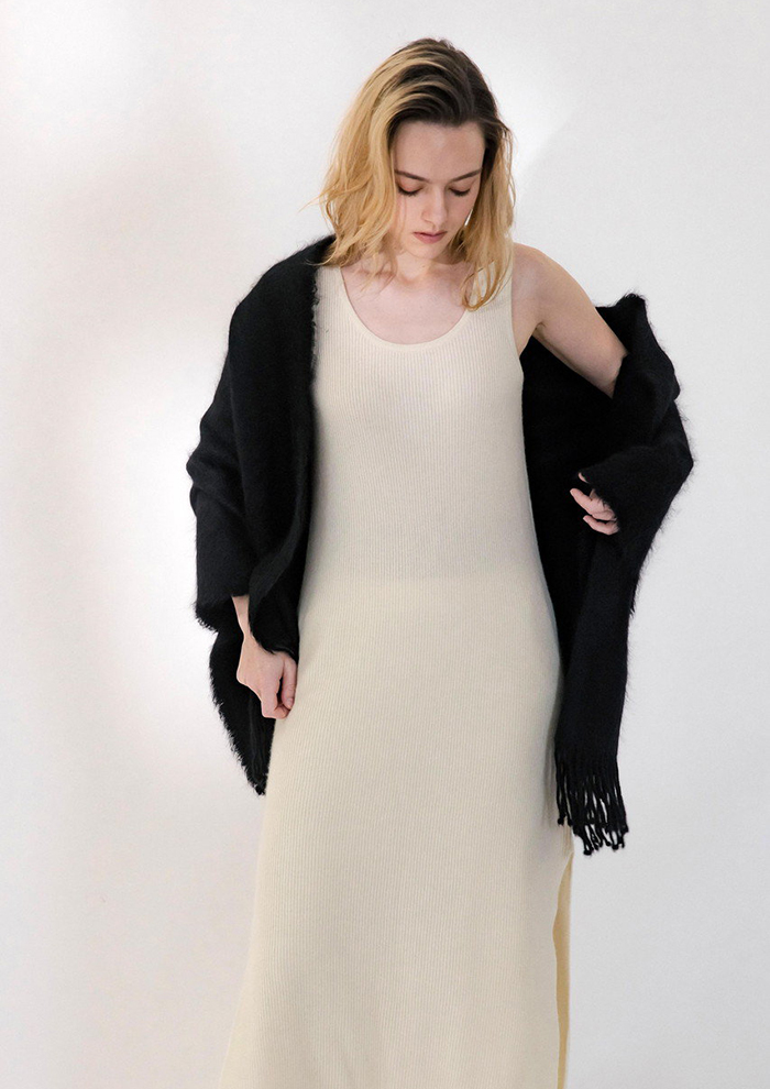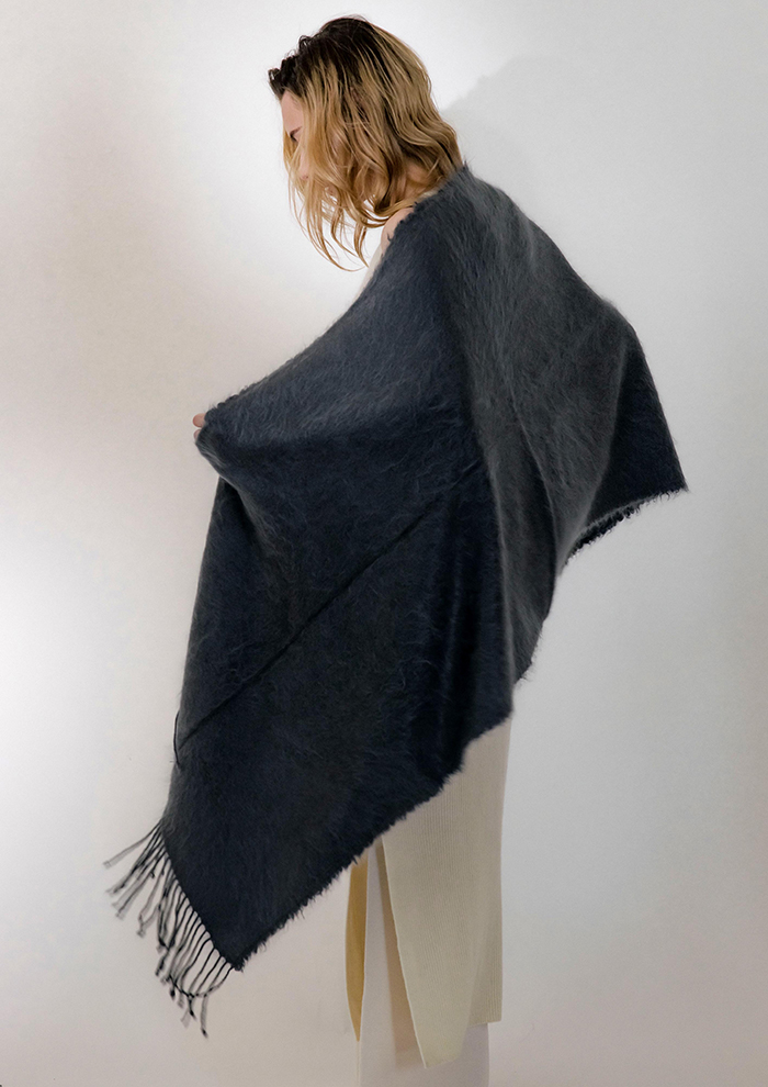「ミンクのような上品な光沢をまとえるストール。カシミヤ本来の柔らかさと包み込むような暖かさが、思わず触れていたくなる心地よさを生み出します。特殊なファー加工の存在感は、ライトアウターとしても活躍するほどの華やかさ。ベーシックなデザインでありながら、素材の良さがしっかりと際立つ特別な一枚です」。
