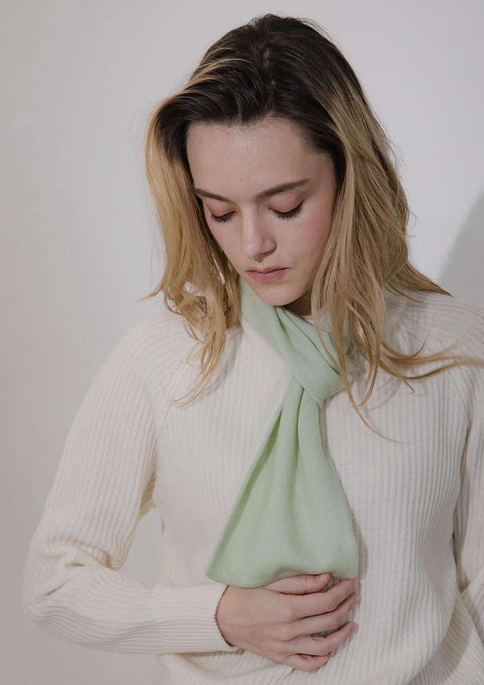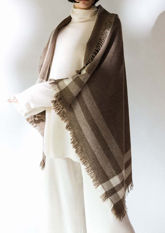 「上質な無染色のオーガニックカシミヤ糸を使ったリバーシブルマフラーも要チェック。両面で表情が変わるぜいたくな仕様と、とろけるような肌触りに癒されます。さらりと巻くだけでクラスアップする、大人のための冬小物。朝晩の冷え込みが深まるこれからの季節、軽やかで暖かいカシミヤが首元をしっかりと守ります」。