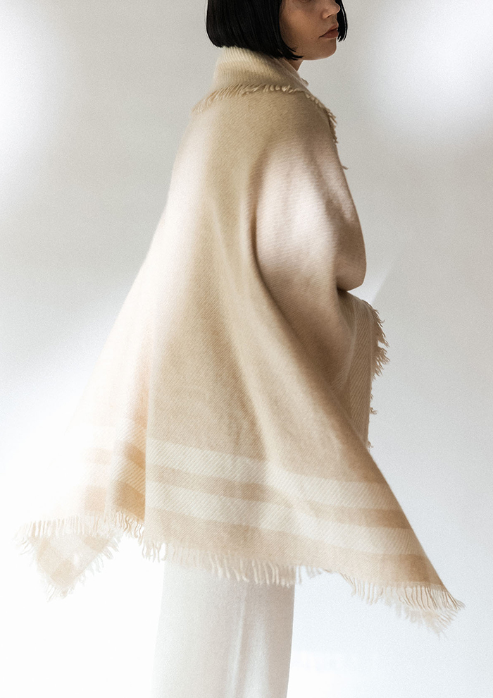 「無染色のオーガニックカシミヤ糸を使い、空気を含むように織りあげたブランケット。カシミヤ本来の柔らかさや温もりをダイレクトに堪能できる逸品です。ふんわりとした心地よい暖かさは、ずっと触っていたくなるほど」。