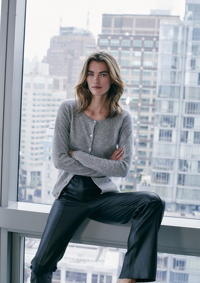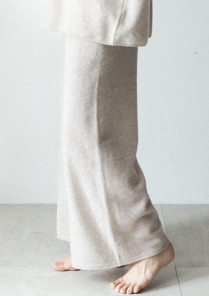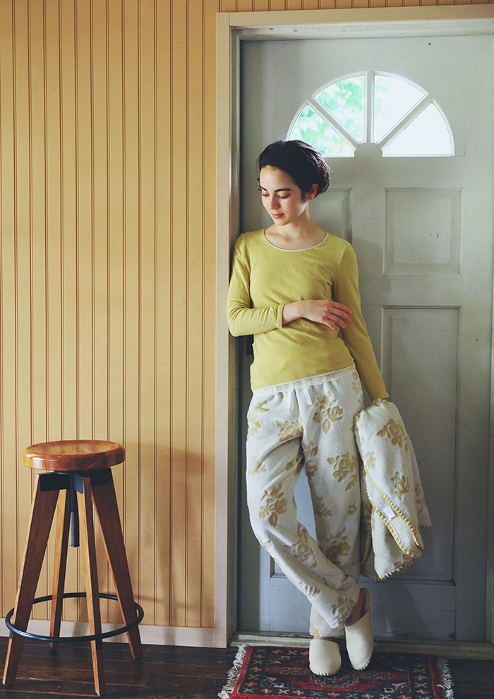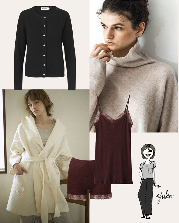「素肌に優しいオーガニックカシミヤ100%素材で仕上げた、「ドンリー」のプルオーバーとワイドパンツ。やさしい色合いと風合いが魅力で、暖かさも抜群です」。