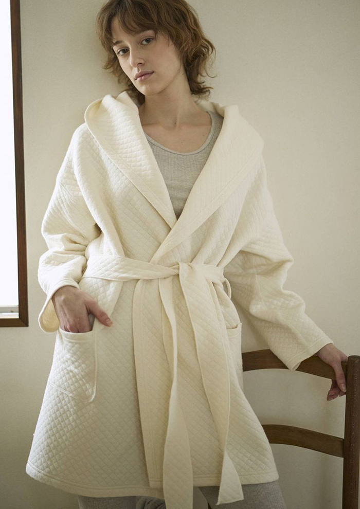 「リラックス感と上品さを兼ね備えたキルティングフーデットガウンコート。ふわりと軽いオーガニックコットン素材で、心地よい着用感です。ゆったりとしたシルエットが大人の抜け感を演出し、ナイトウェアの上からはもちろん、ワンマイルウェアとしても気軽に羽織れる一着です。」