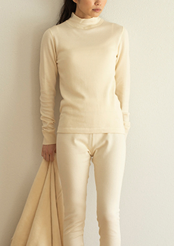 「寒がりやさんにぴったりのふわふわあったかインナーも要チェック。オーガニックコットン100%の3段構造が空気の層をつくり、肉厚素材とリブ仕様で冬も快適な着心地です」。