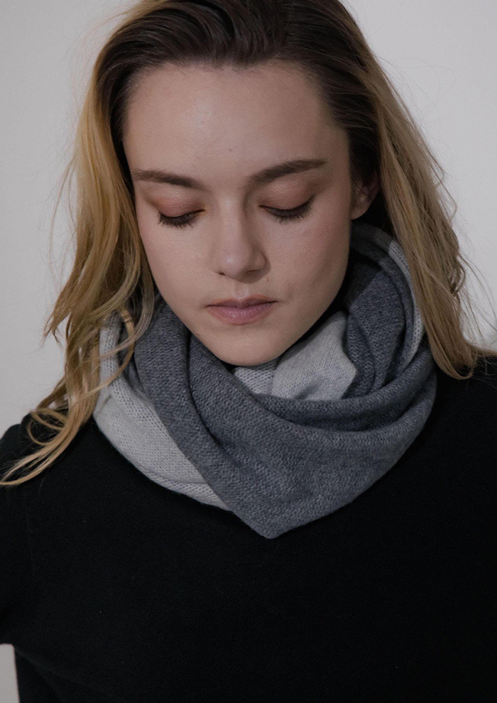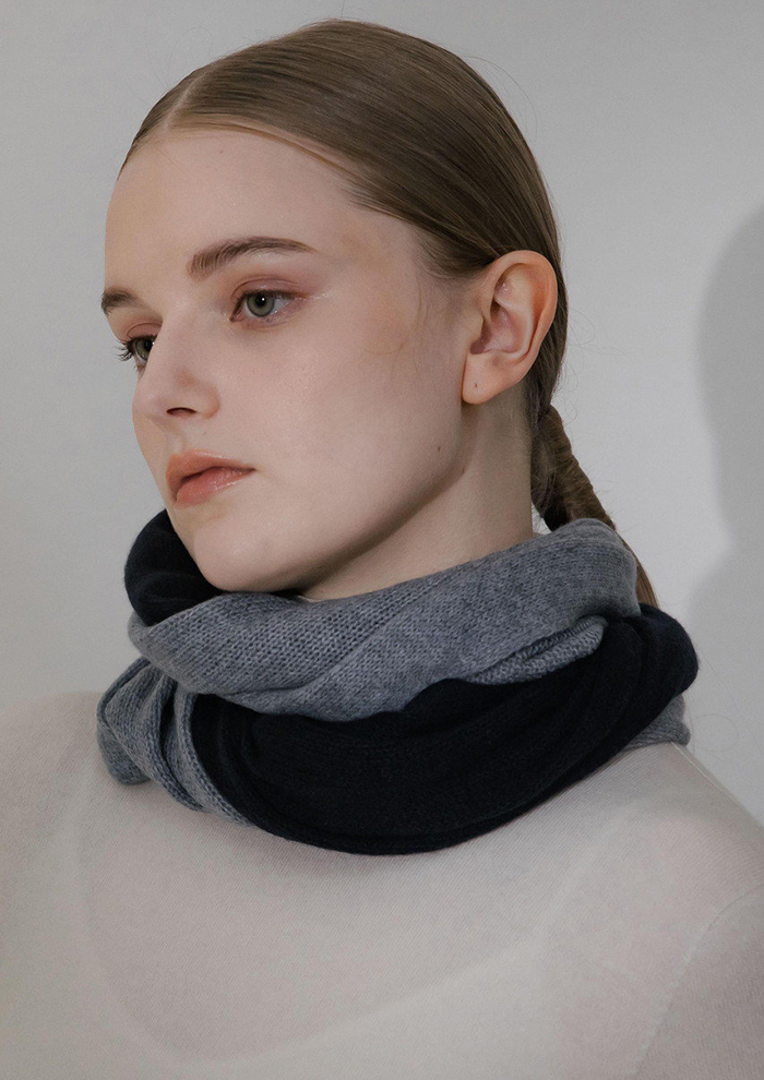 「生後1年未満のカシミヤ山羊から採った極細ベビーカシミヤ使用。ふんわり柔らかく保温性も抜群で、ほどよいボリューム感とナチュラルなバイカラーが合わせやすい一枚です」。