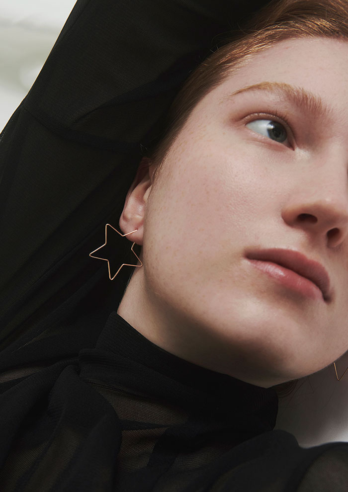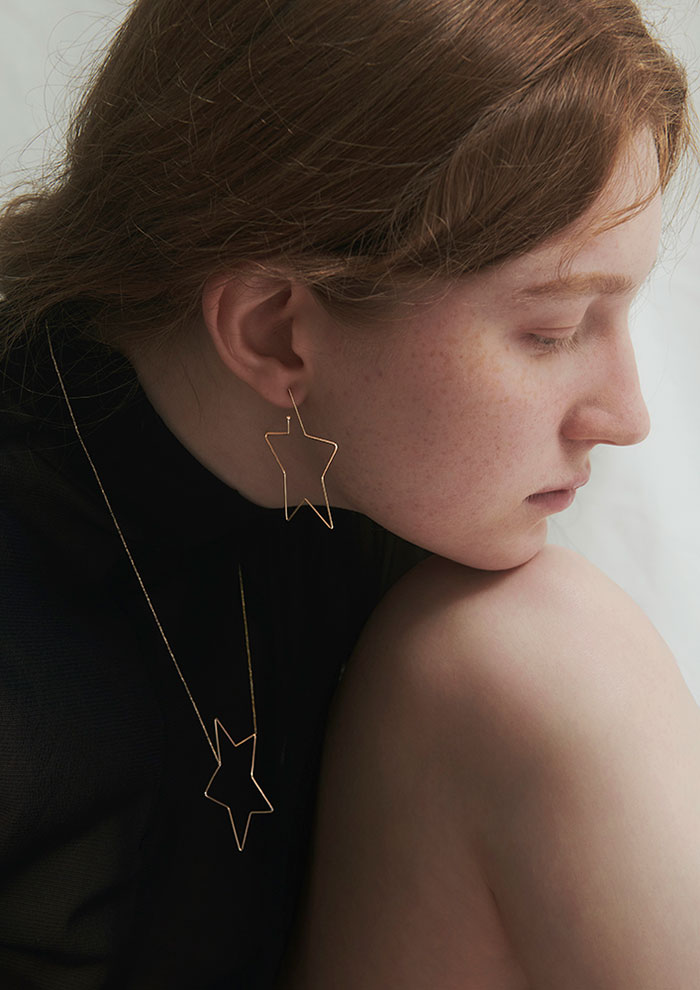 「削ぎ落とした華奢なシルエットが、端正でスマートな顔立ちへと導くピアス。横顔に映えるサイズ感ながら、軽やかな抜けがあって大人っぽく着用できます。星のモチーフは“希望”の象徴。夢を実現したいときや新たなチャンスを呼び込みたいときにつければ、そっと心を支える存在に」。