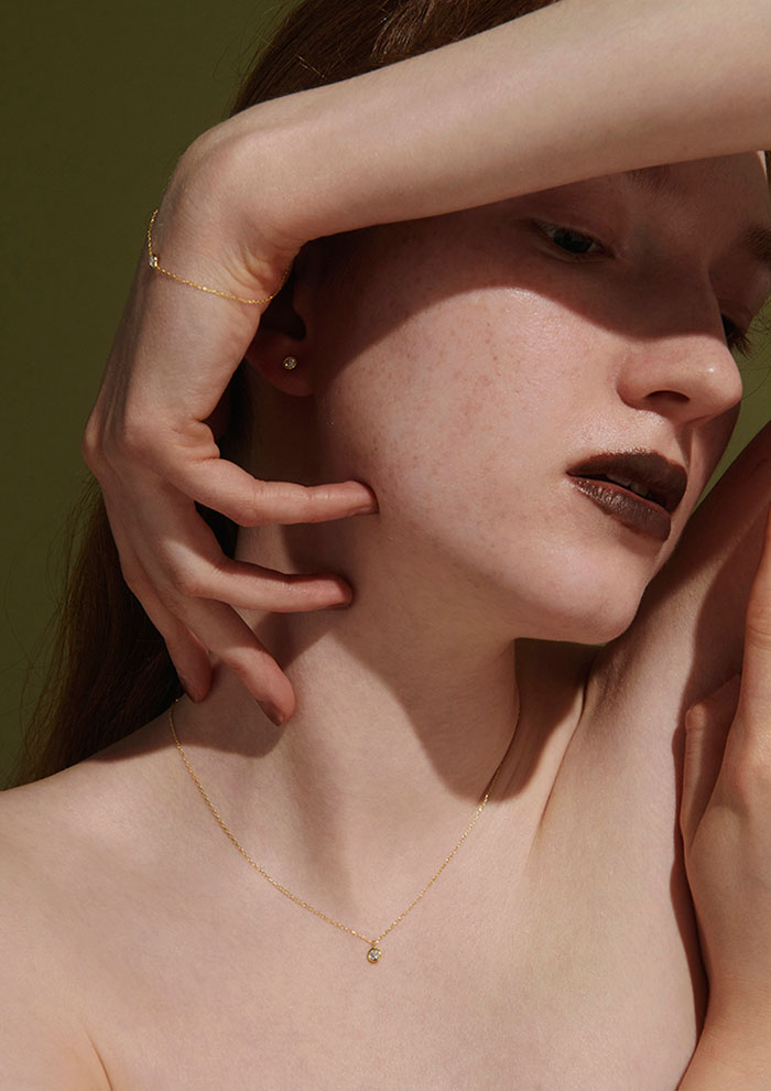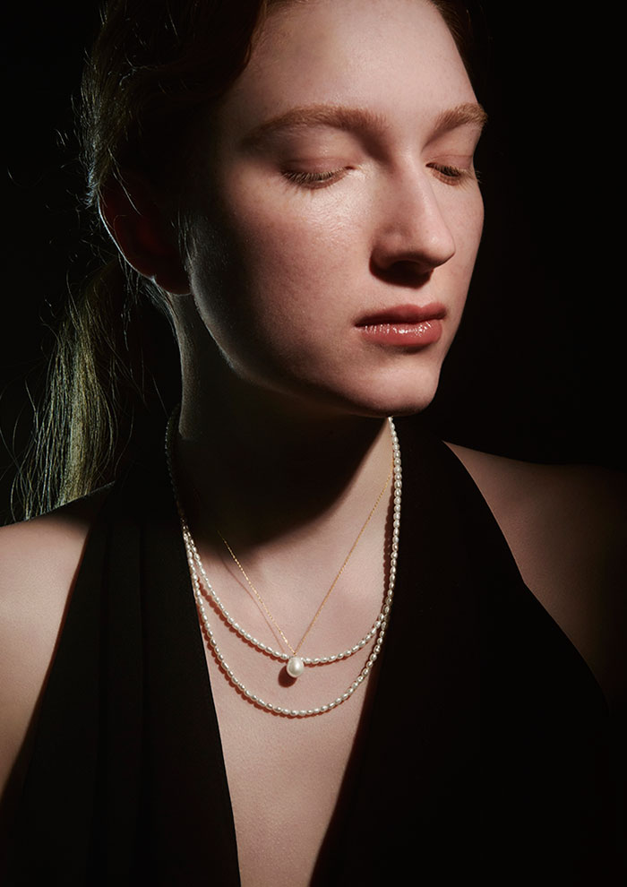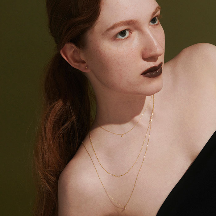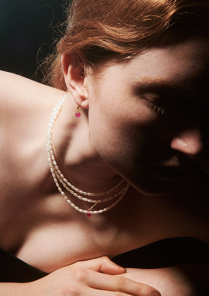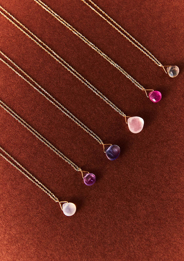 「あえて石枠にはめないことで、天然石の神秘的で麗しい佇まいを堪能できるネックレス。肌の上でしなやかな光を放ち、まとう人の繊細さと美しさを際立たせます」。
