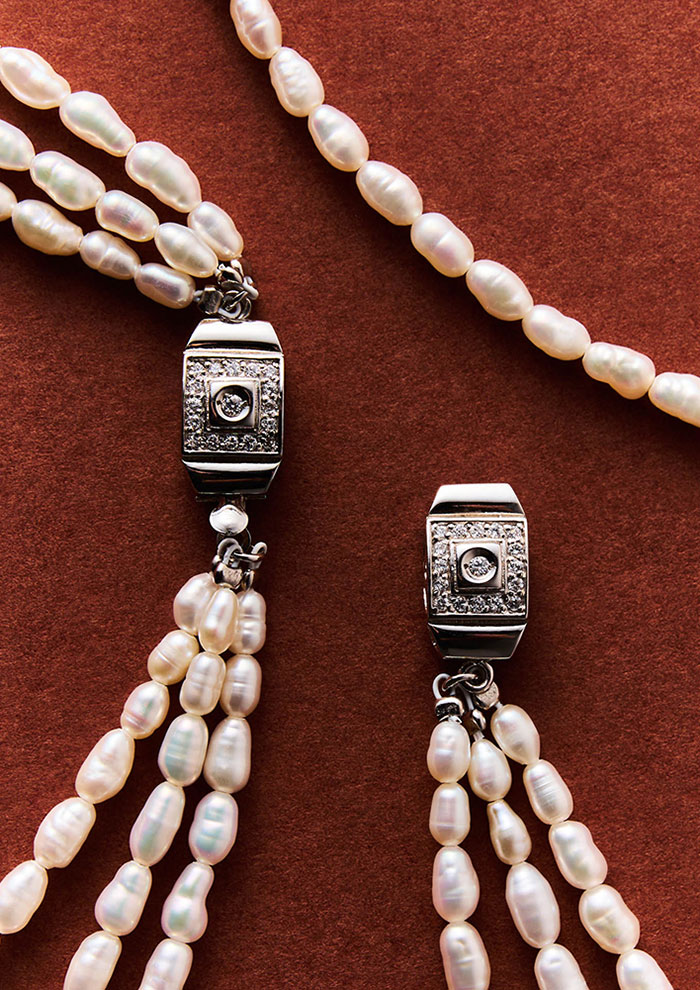 「優雅に佇む淡水パールを連ねた、クラシカルな雰囲気漂うネックレス。ビンテージの装飾品を思わせる留め具が、バックスタイルにも存在感を宿します。35cmと40cmの2つの長さからお選びください。デコルテに映える35cmは、首まわりに余白のあるトップスと合わせて。流麗な孤を描く40cmは、何気ないニットやシャツに洗練を添えます」。