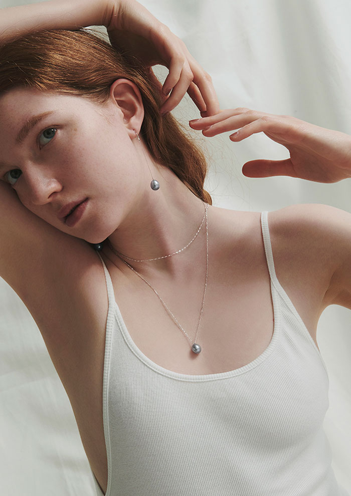 「大自然のエネルギーと神秘が宿る、淡水パールのネックレス。サイズや形状の異なる淡水パールをランダムに配し、情緒的な一面を表現しています。顔まわりに立体感と奥行きが生まれ、洗練された印象を後押し。グレーやブラックなどのトップスと、大人のワントーンコーデを楽しんで。ロングピアスは、耳元で揺らめく流麗なフォルムとともに、知的な表情を実現します」。