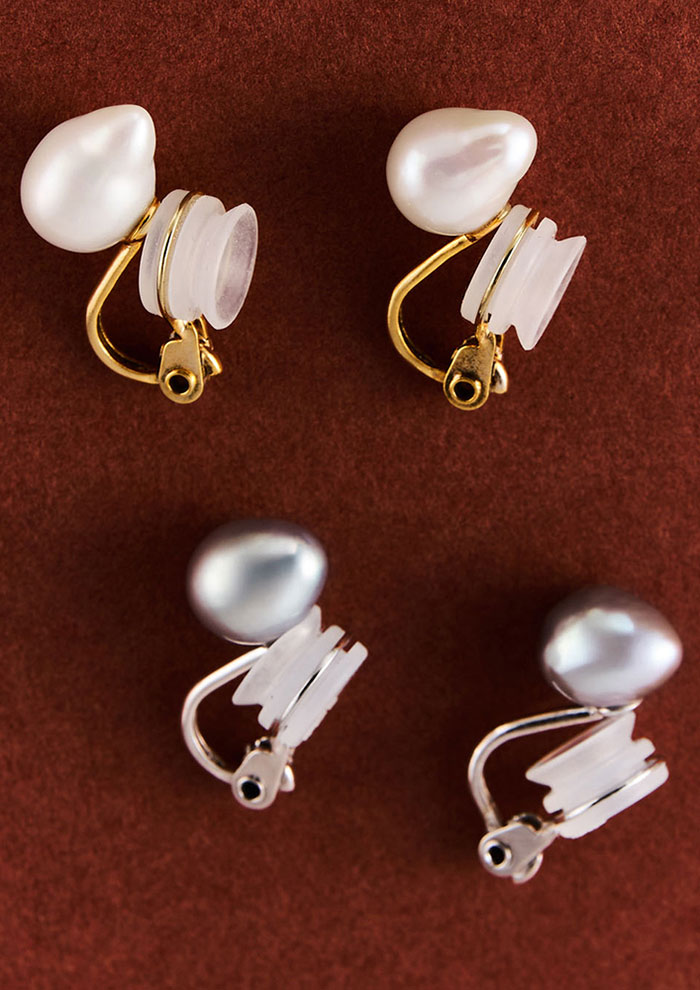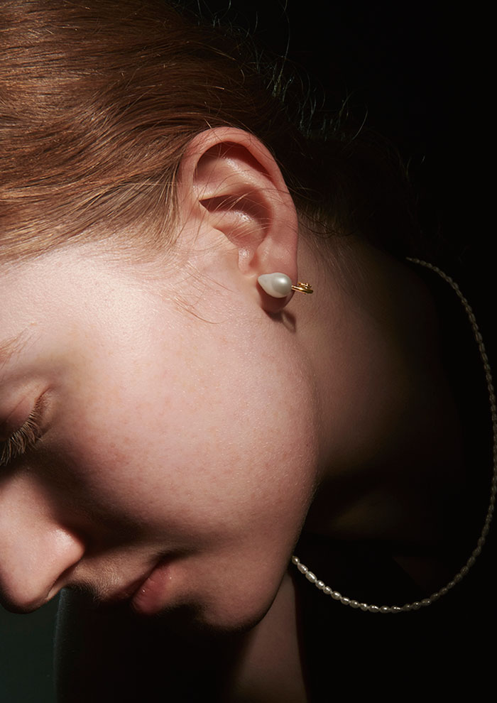「ブランド初のイヤリングはティアドロップ型のパールを採用。ミニマルながら洗練されたデザインです。耳へのなじみがよく、着用すると留め具が隠れるのもうれしい特徴。ほどよいボリュームがあり、ドレスやジャケットといった緊張感漂う装いとも呼応します」。