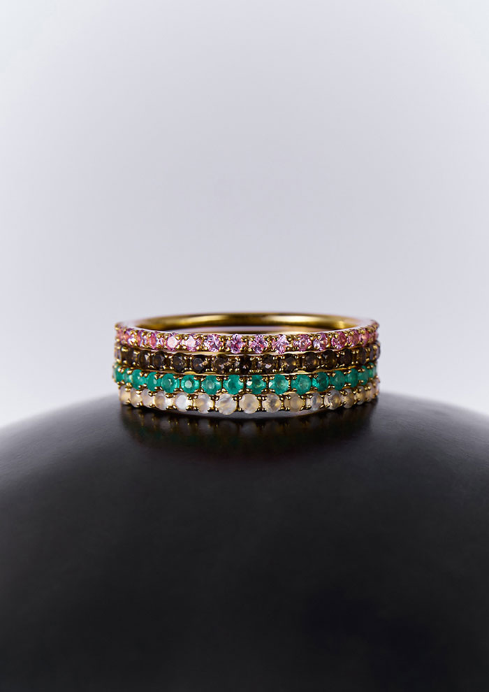 「手元の収まりがよく、所作を美しく見せてくれます。6サイズ展開しているので、ピンキーリングとして使ってもすてき。色違いをレイヤードして手元を華やかに演出するのもおすすめです」。