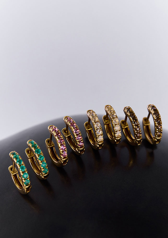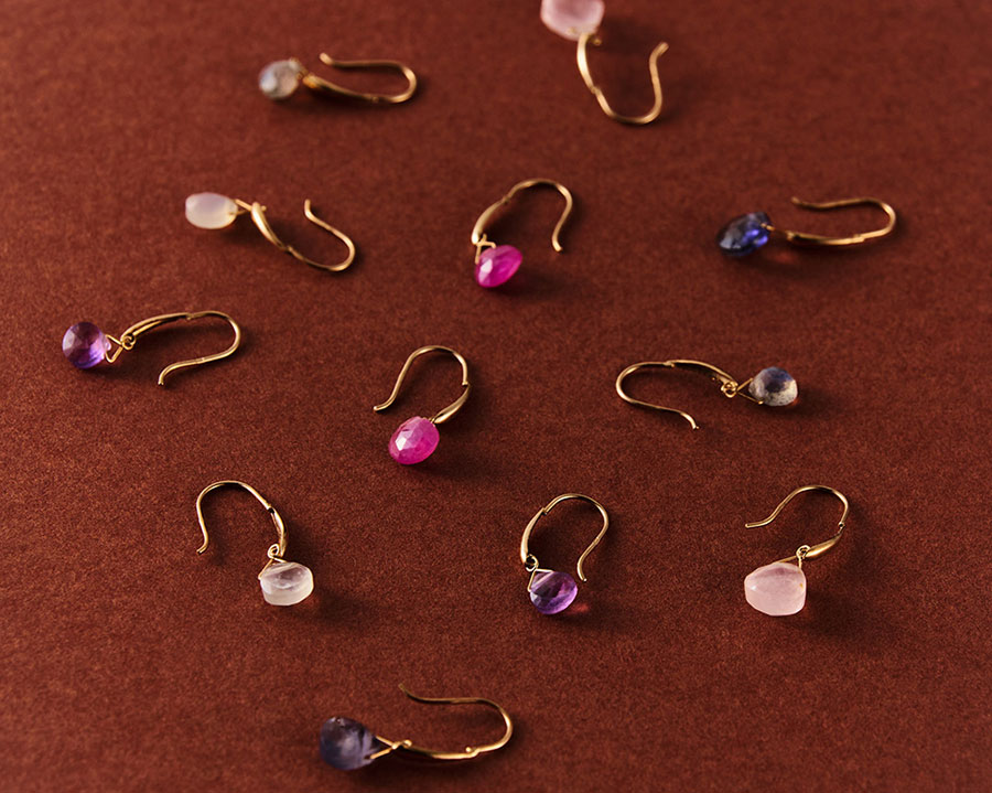 「天然石の澄んだ色合いが耳元に浮かぶピアス。有機的な曲線を描くK10のフックと合わさって、優美で洗練された表情をつくり出します。ルビーは“情熱”や“勇気”、ローズクオーツは“真実の愛”など、それぞれの意味が込められており、石言葉から選んでも、直観で心引かれた偶然の出会いを大切にするのも◎」。