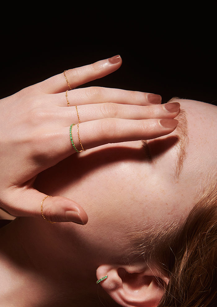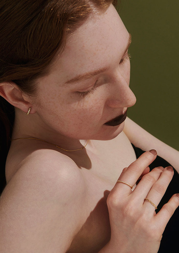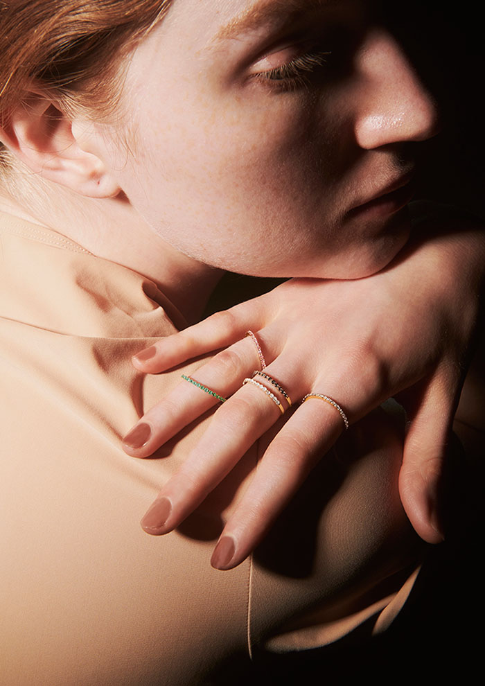 「ミニマルで洗練されたデザインながら、ひと粒のダイヤモンドが高貴な存在感を放ちます。その清らかな輝きは、まとうたびに強さや勇気を与えてくれ、自信に満ちた表情を引き出してくれるはず。フープピアスとハーフエタニティのリングは、K18のフープにダイヤモンドを散りばめたリュクスな輝きを放つ特別なデザイン」。