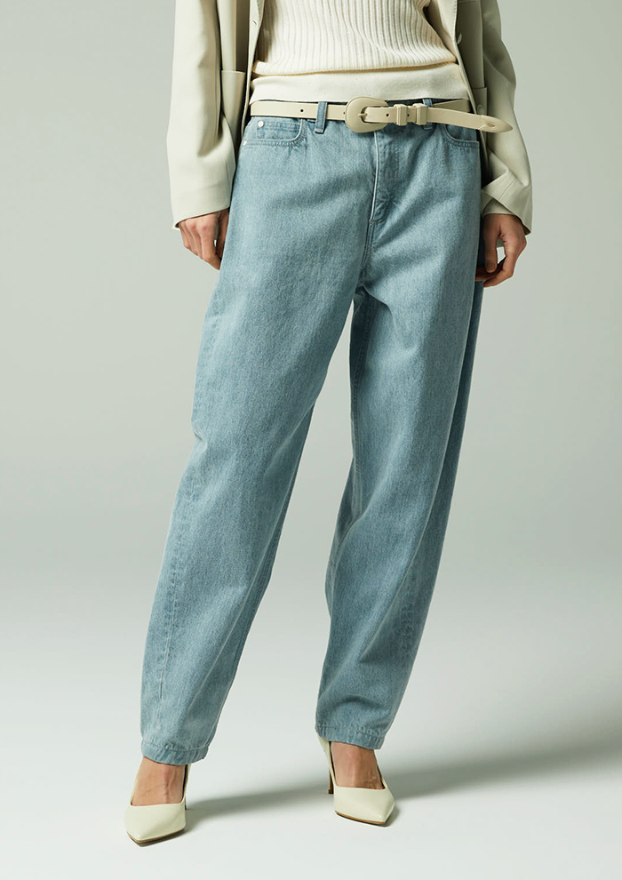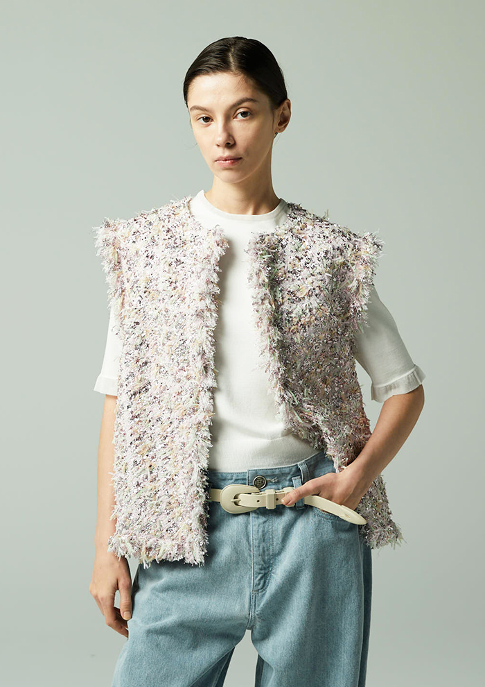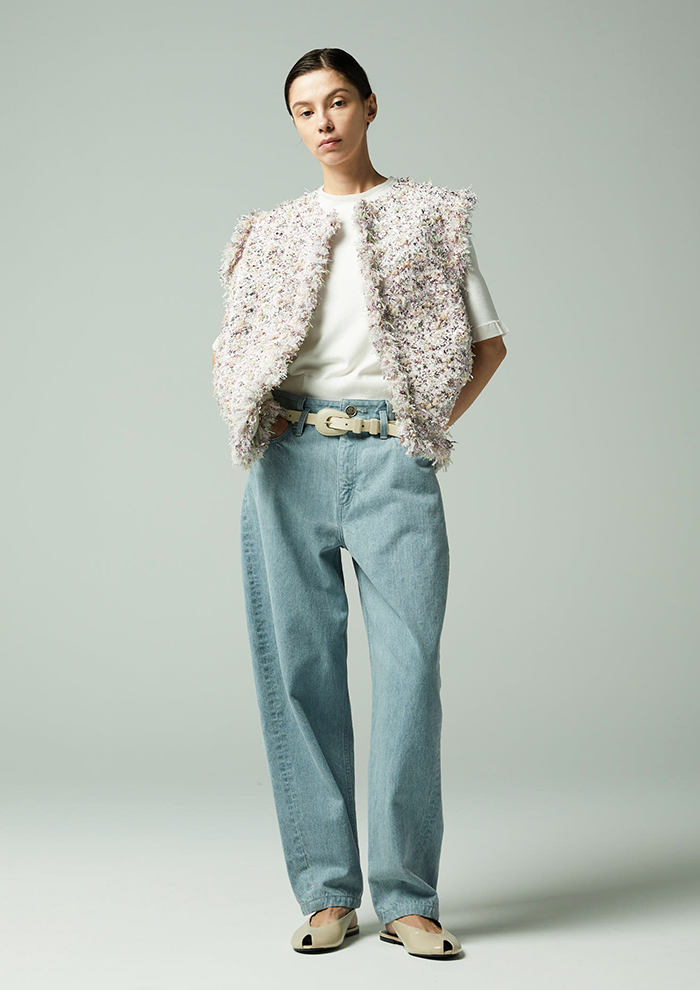 「まずは、オリジナルのサマーツイードで仕立てたジレが主役のスタイリング。フランスの老舗メーカーでつくり上げたツイードは、リボン調の糸や輝きのある糸などを複雑に織り上げることで、光を含んだような奥行きある表情に。独自の二次加工によって、ほかにはない高級感とインパクトも備えています。合わせたデニムは、薬品を使わず、室戸岬の海洋深層水で加工。ミネラル豊富な海洋深層水だからこそできる独特のグレイッシュなブルーが魅力です。ツイードの華やかさとデニムの軽やかさが、ひと足早く春の気分をお届け」。