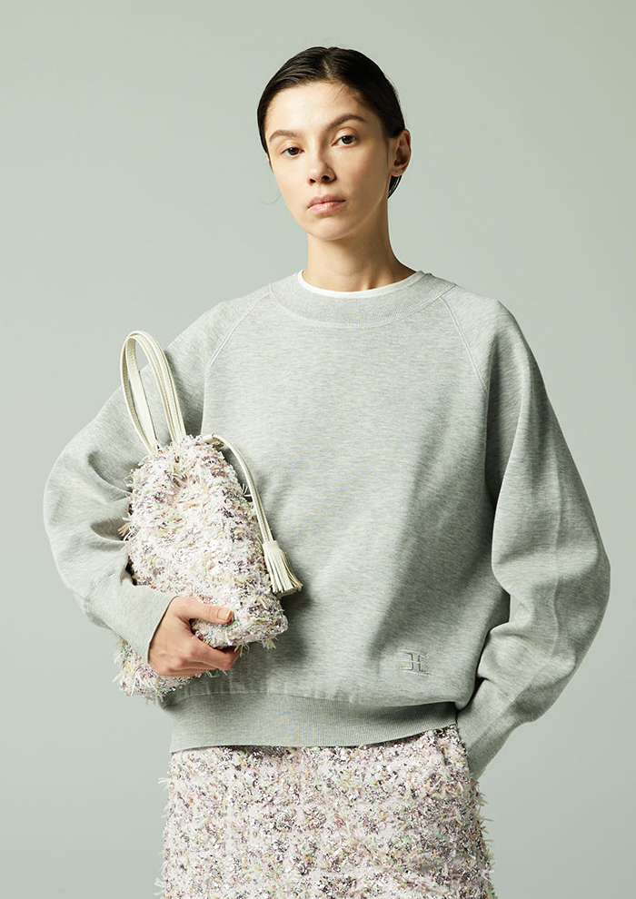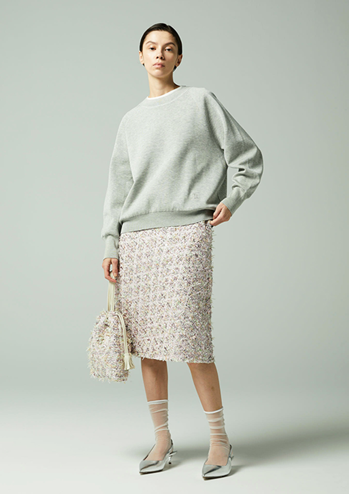 「上記と同じオリジナルのツイード素材を使って、スカートも製作。スウェットライクなニットを合わせるとデイリーに活躍します。シルクのツヤとコットンの柔らかさを掛け合わせたニットは、ほどよいハリ感によって美しいシルエットをキープ。スウェット感覚でカジュアルに着こなせるのに、品のある雰囲気を演出します。シンプルなデザインで素材のコントラストを引き立てて」。