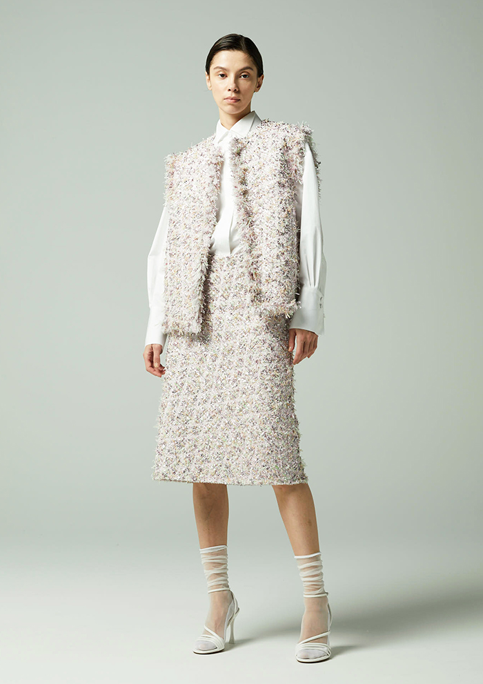「こちらは、ツイードジレとスカートをセットアップで楽しむスタイリング。ツイードの美しさと華やかさがより際立ちます。インナーには旬のウィングカラーシャツを合わせ、シーズンムードを更新。特別な日の装いとしても頼れる、品のある着こなしです」。