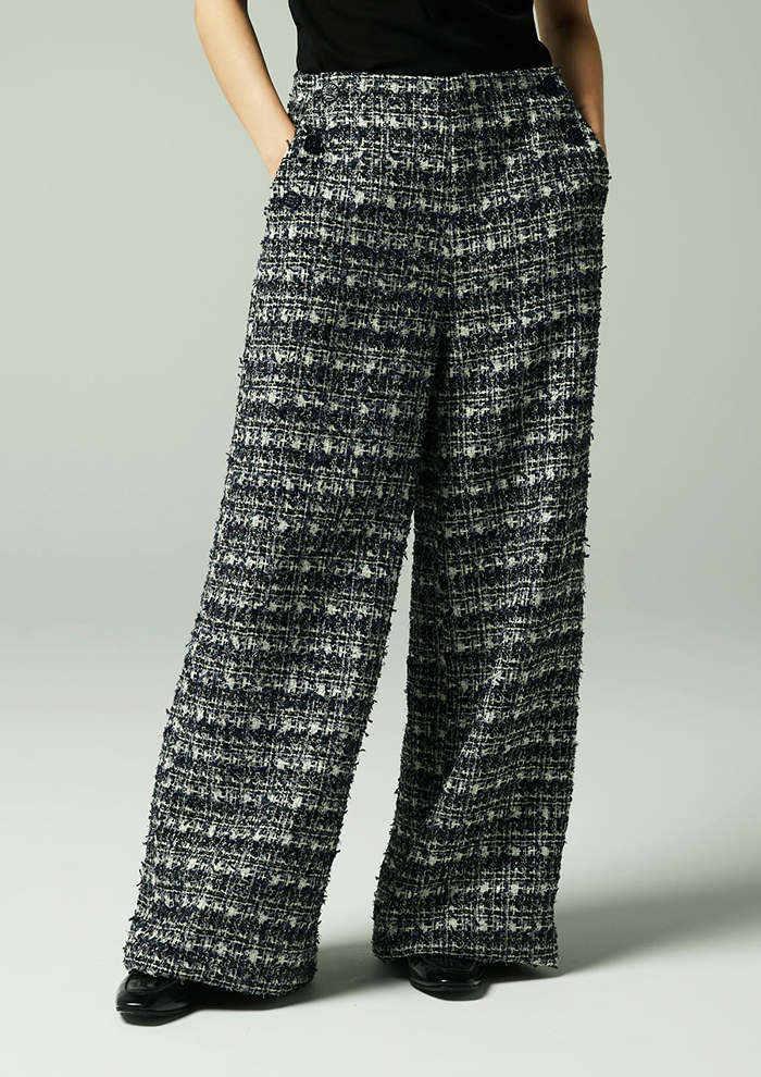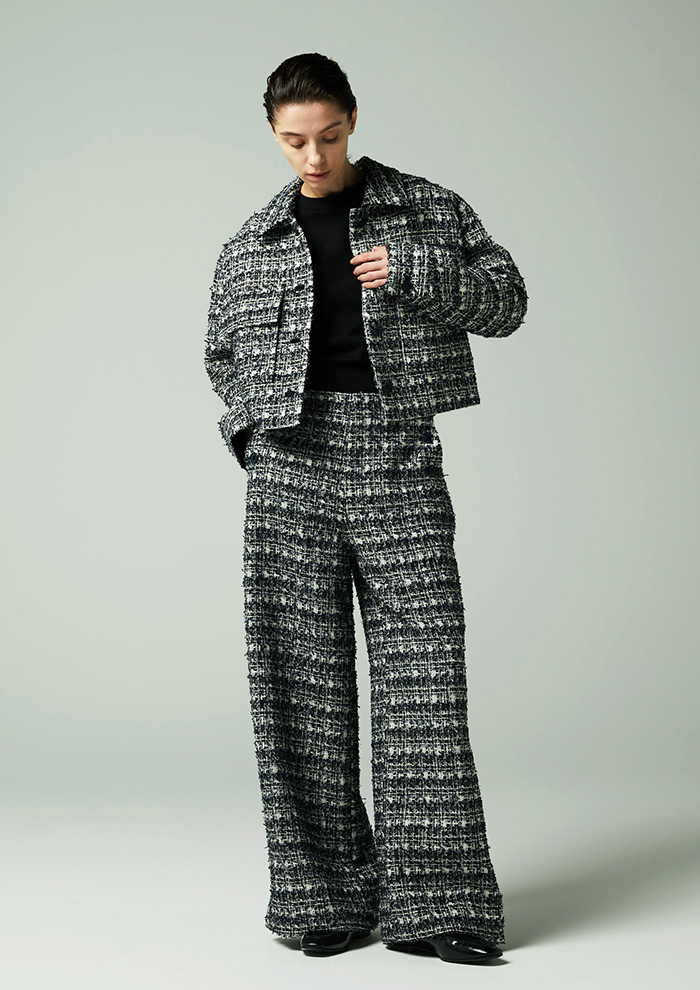 「オリジナルツイードのバリエーションとして、モノトーンのタイプもご用意。13種類もの意匠糸を組み合わせ、デニムのようにネイビーに染め上げた、深みがありながら軽やかな風合いの素材です。フラップ付きのポケットが印象的なクロップドジャケットと、マリンディテールを効かせたパンツを展開。セットアップで着こなせば、さりげないボタンのツヤが装いにリズムを添え、端正でありながらモードな存在感を放ちます」。
