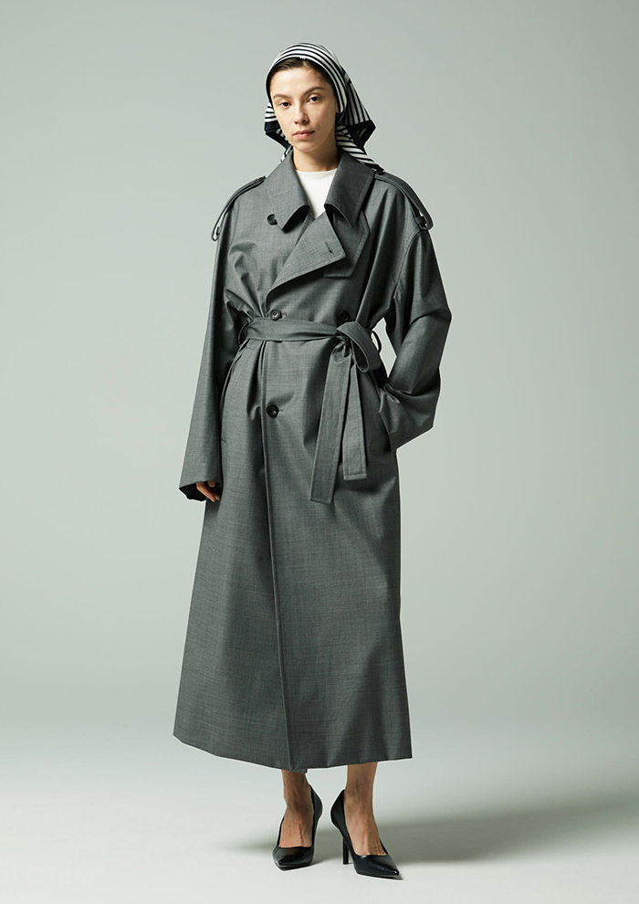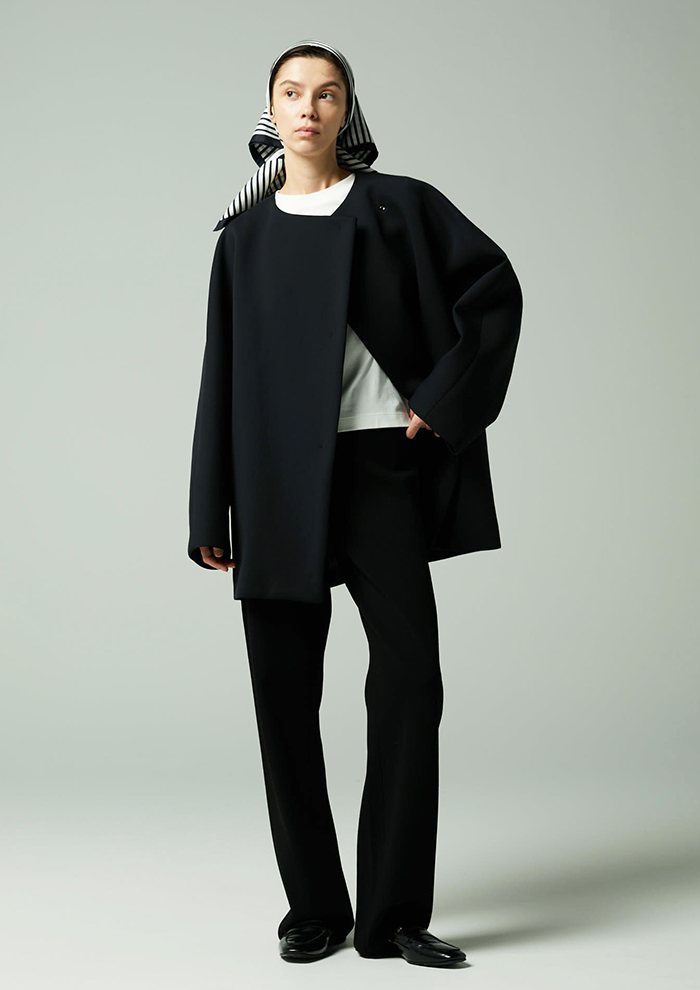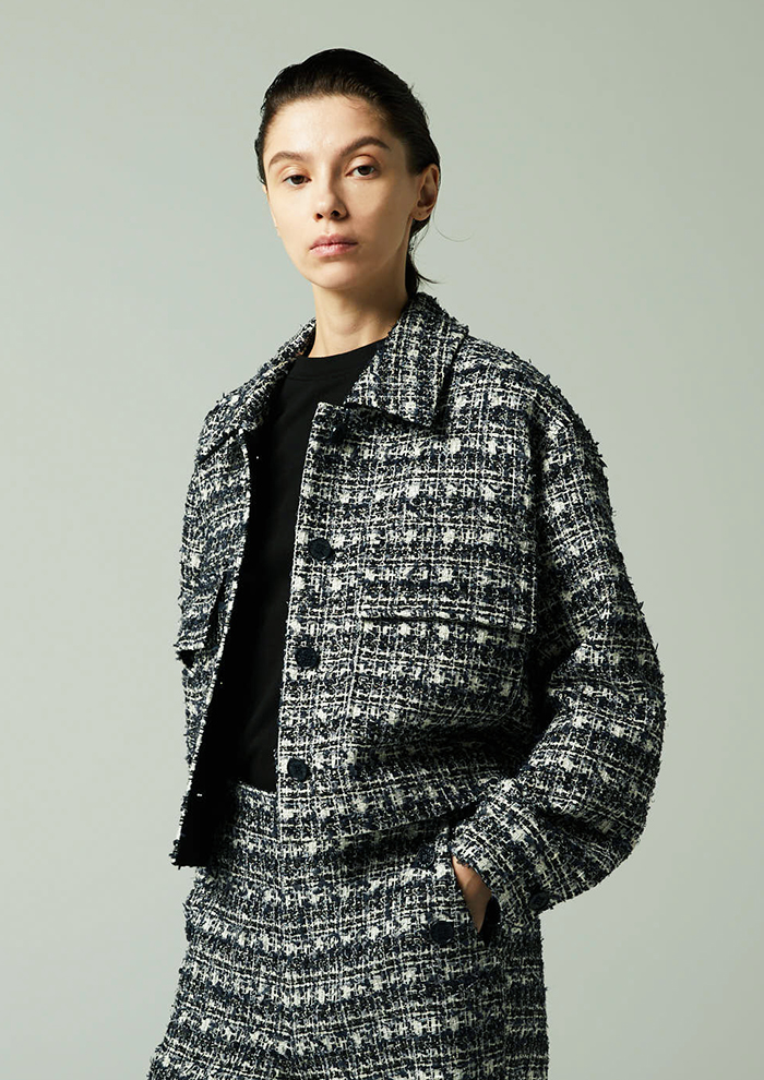 「ツイードアイテム以外にも、早いシーズンからお召いただけるアウターもラインナップ。立体的なシルエットがポイントのショート丈コートは、非常に軽く、高いストレッチ性で快適な着心地です。シーズンレスに活躍するスポンディッシュなタッチと、扱いやすいイージーケアもうれしいポイント。 コクーンシルエットが自然な丸みを描き、包み込むように日常に寄り添います」。