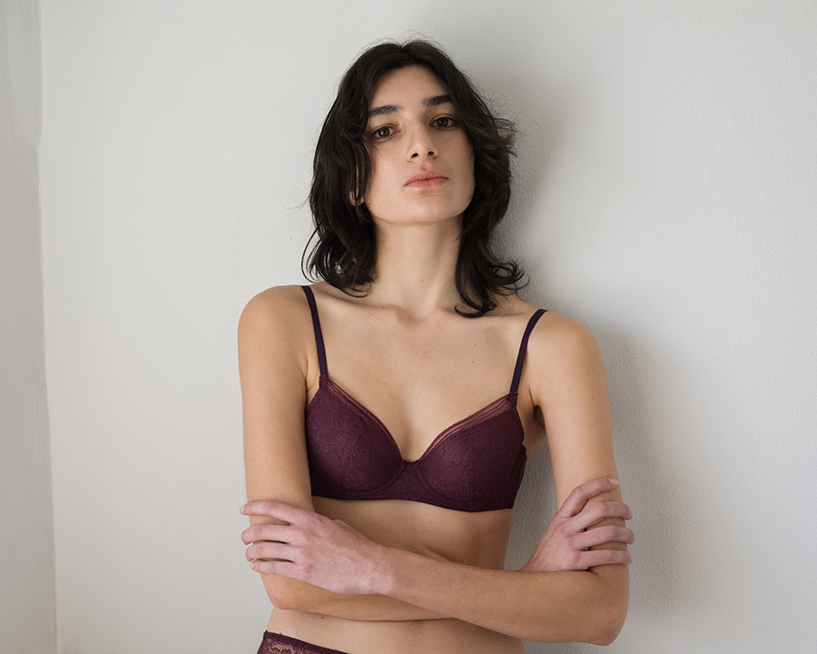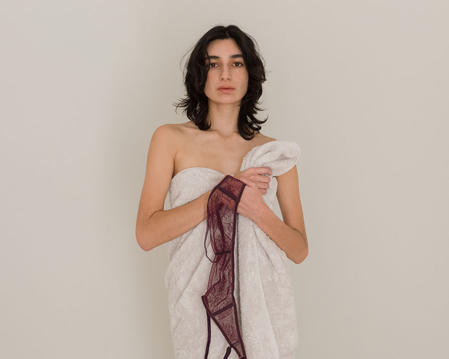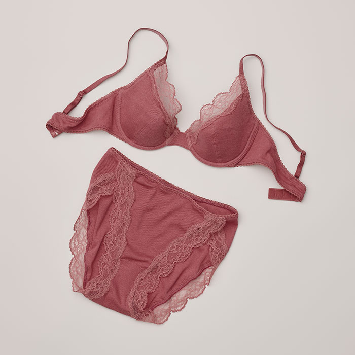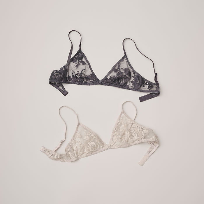 「こちらは、過去コレクションで使用した残素材のリネンのリバーレースを使用したノンパテッドブラ。ダイナミックな花柄が肌に映えるエレガントなアイテムです。シンプルなつくりなのに、身につけると存在感抜群。コットンヤク素材のショーツとも相性がとても良く、ブラはレース、ショーツはコットンヤクと、あえてアンバランスにコーディネートするのもおすすめです。残素材で数に限りがあるため、気になった方はお早めにチェックを」。