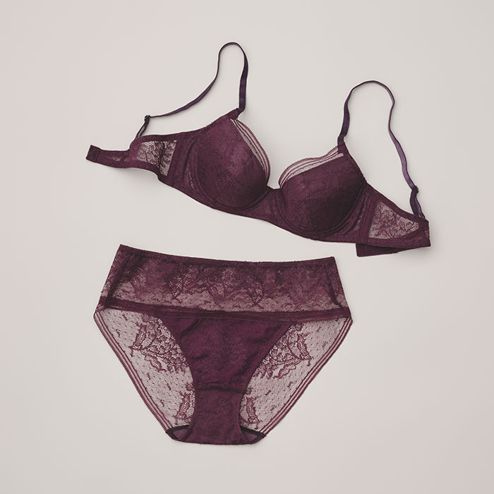 「3/4カップブラジャーは、リバーレースをぜいたくに使用した華やかなデザイン。しっかりとした土台でバストを支え、安定した着用感を叶えています。ショーツはスタンダート、タンガの2タイプ。後身頃のヒップはアウターにラインが響かないようゴム無しに。どんなアウターとも相性が良く、デイリーに着用できるため、軽やかに美しくコーディネートを楽しめます」。