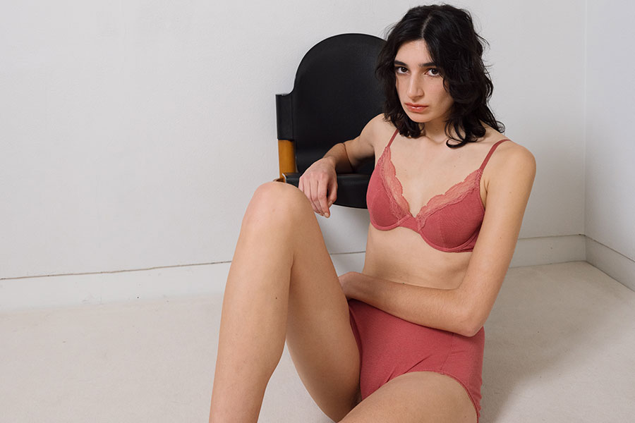 「スペシャル企画として「デプトカンパニー」代表でありアクティビストのeriさんと、初となるコラボランジェリーを製作。ランジェリーでは珍しいコットンヤク素材のアイテムを中心に、過去のコレクションでも使用したフレンチリネン混の残レースを用いたブラジャーも展開しています」。