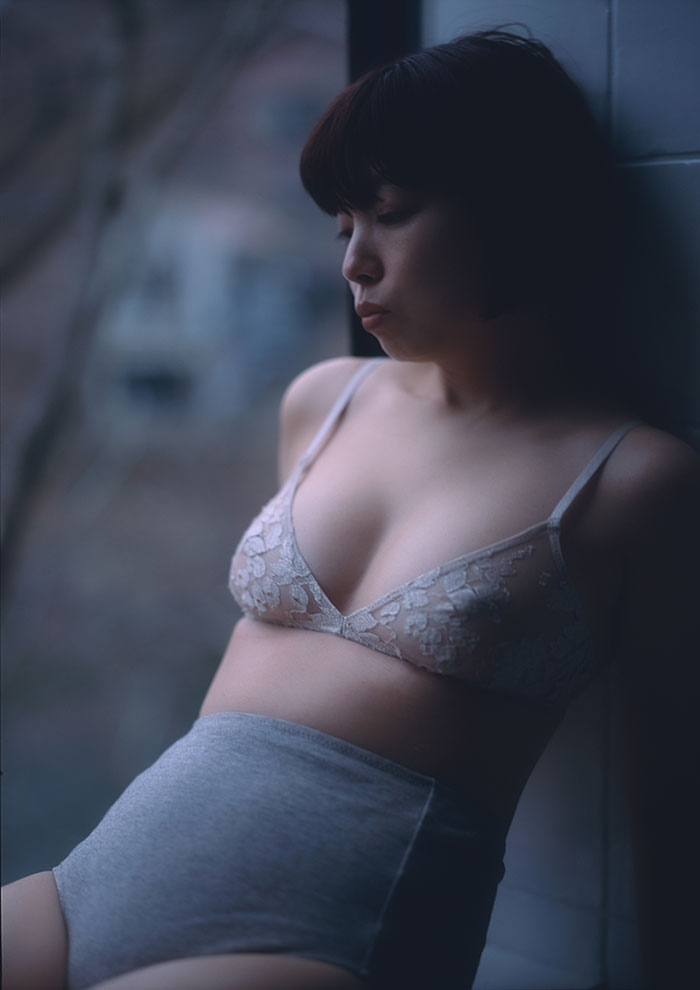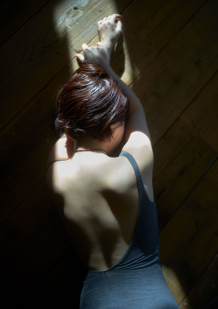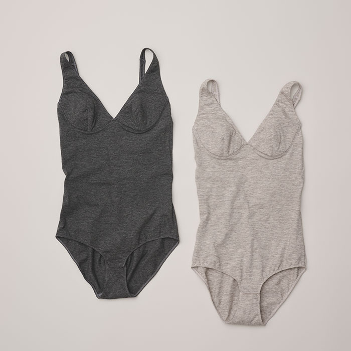 「透け感が無く暖かみもあるコットンヤク素材のボディスーツは、バックスタイルの開きを大きめにしたすっきりとしたデザイン。ブラジャーとショーツが一緒になっているオールインワンのため、お腹まわりは暖かく、インナーウェア的な役割もしてくれる便利な一枚です」。