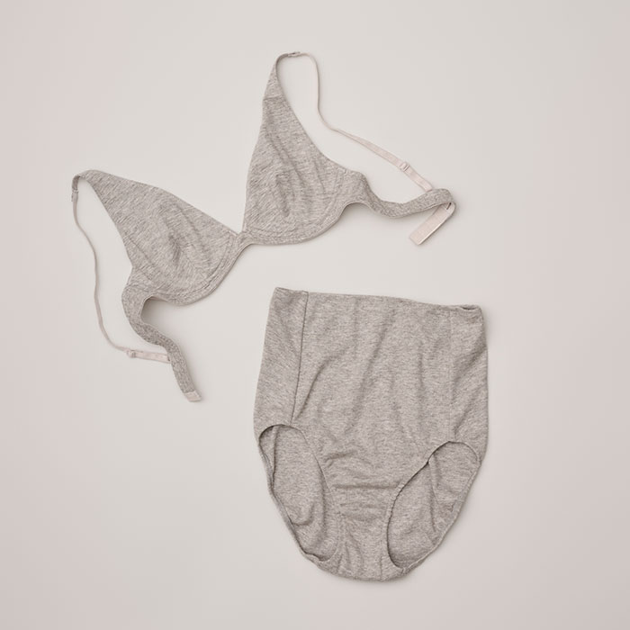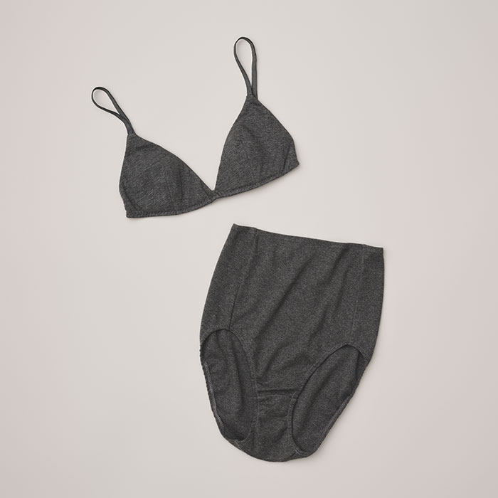 「たびたびコレクションで採用するワイヤーノンパテッドブラですが、天竺素材ではこれが初めて。素材の柔らかさと適度な肉感が絶妙で、つけたときに「気持ち良い~」と感じていただけるアイテムです。そして、つけた時のデコルテラインが美しく見えるカッティングにもこだわりました。ストラップは綿混素材で肌当たり優しく肩への疲労感も軽減。ショーツは1型のみ。おへそあたりまで深いはきこみのハイウエストショーツは、ほっこり感が懐かしい印象です。寒くなってきたので防寒にもとてもおすすめ」。
