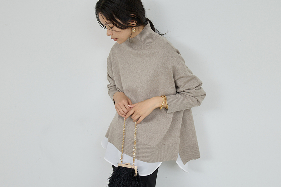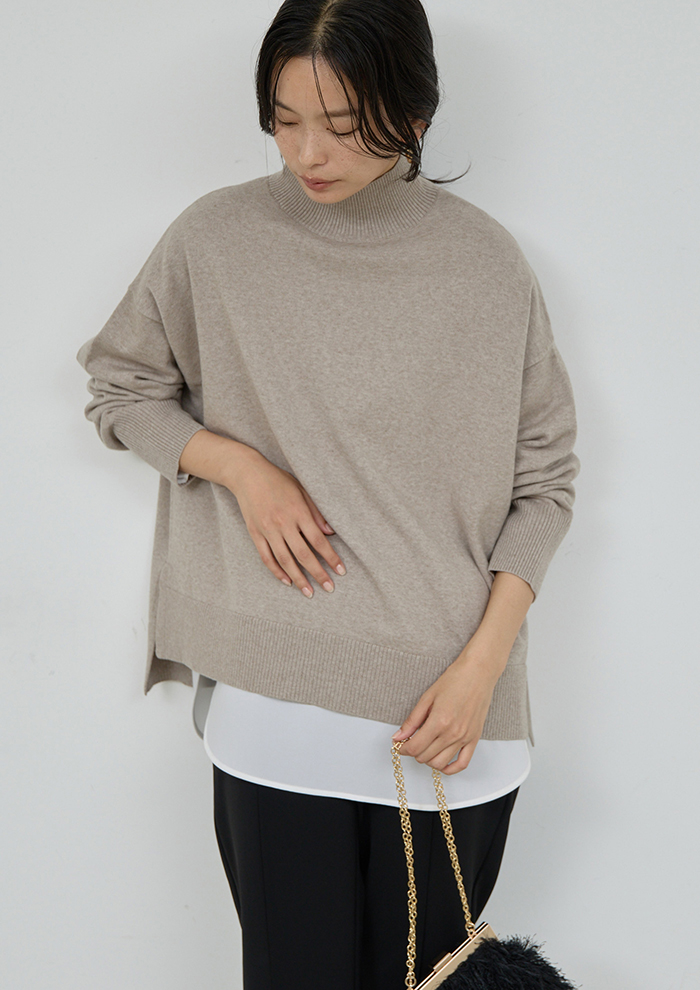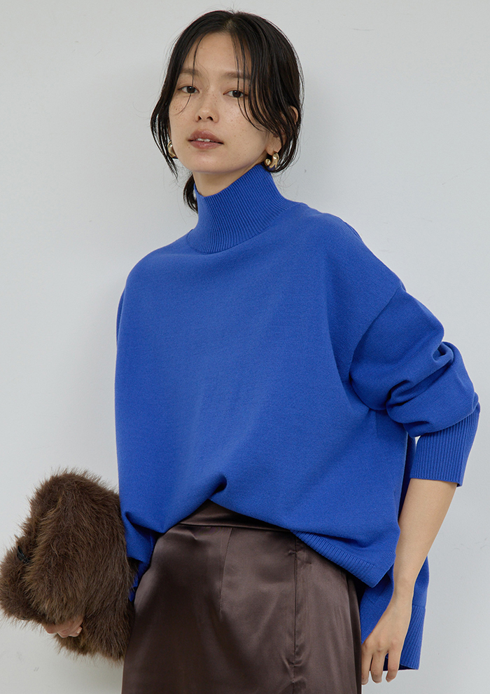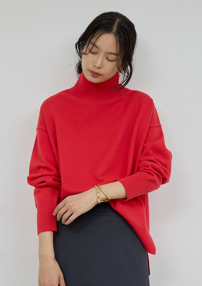 「洗練されたハイゲージタートルニットは、肌触りもよく着心地の良い人気ニット。ほどよい丈感とボックスシルエットでコーディネートの幅も広く、着まわし力抜群! 体型を選ばずすっきりと着こなせます。非ウール素材のため、室内でもコート着用時も快適」。