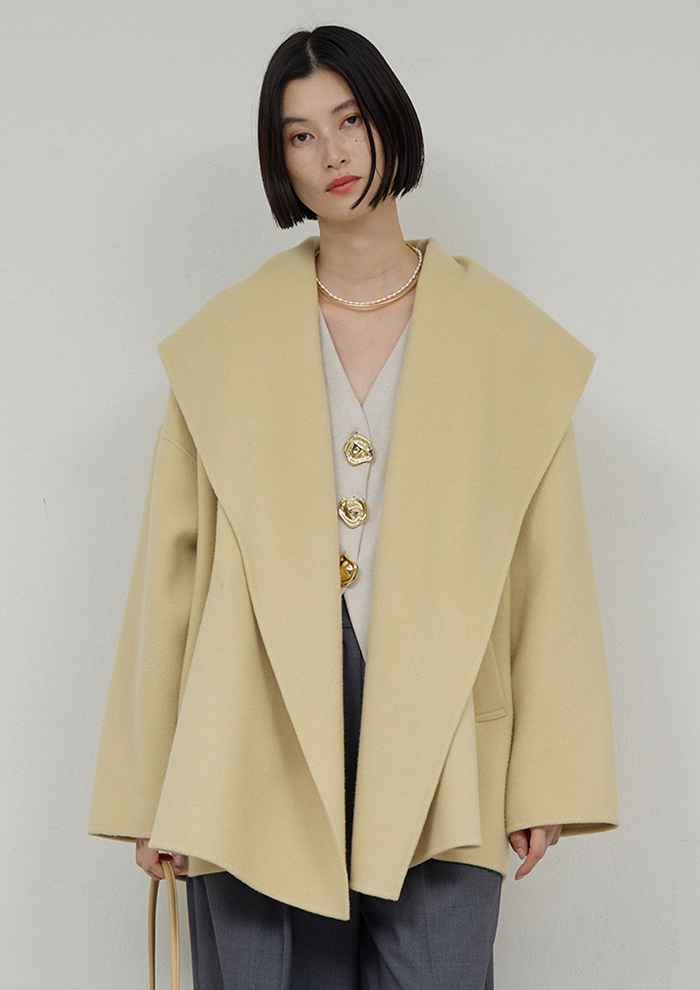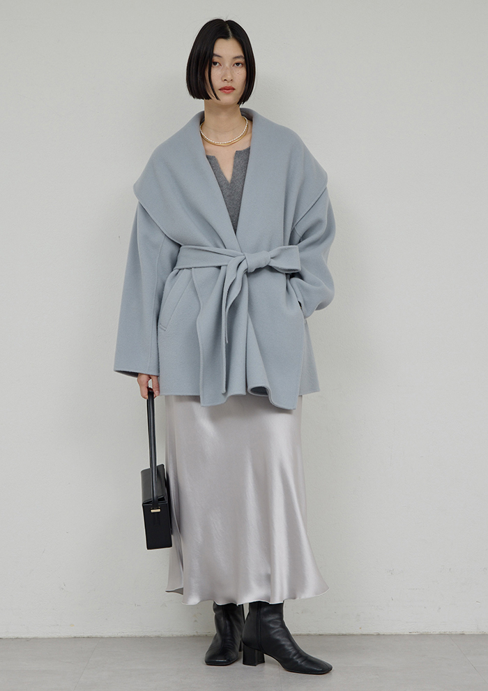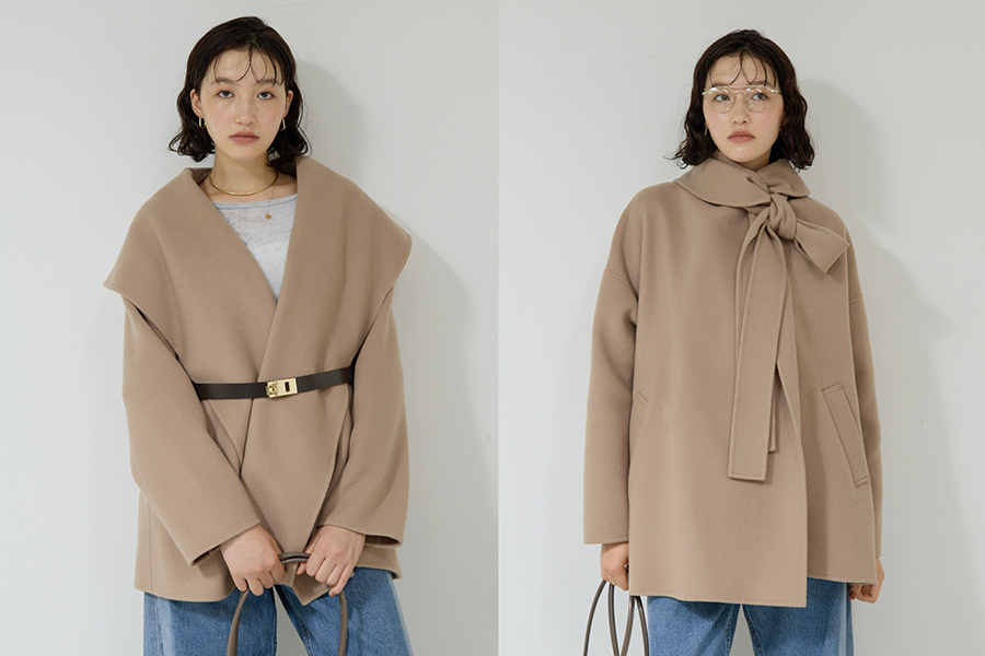 「バサッと羽織るだけで、構築的なフォルムが完成するショールコート。リバー仕立てでとても軽く、ストレスフリーな着心地です」。