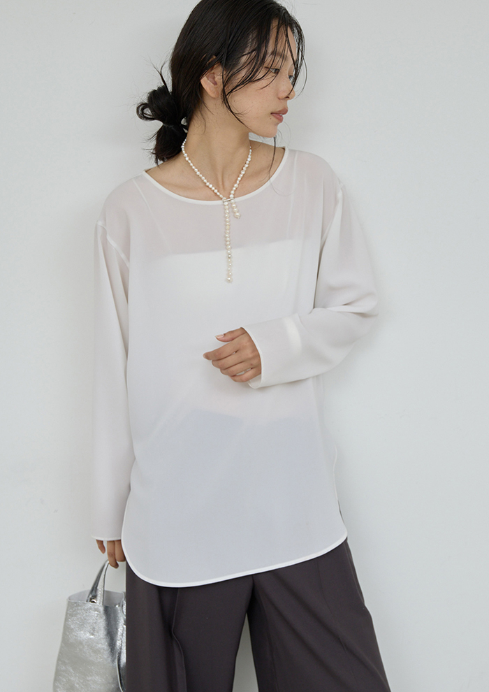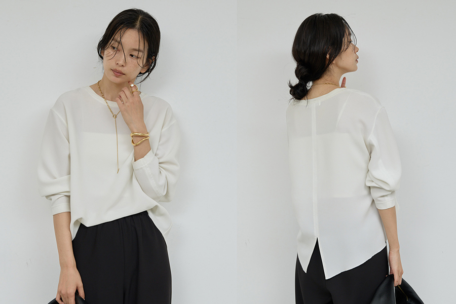 「Tシャツ以上、ブラウス未満。どんなワードローブに馴染む万能ブラウス。表情のあるドライタッチな素材感で、冬はニットやジャケットのインナーに。シワになりにくく、自宅で手洗い可能なイージーケア。洗練された機能美が引き立つミニマルブラウスです」。