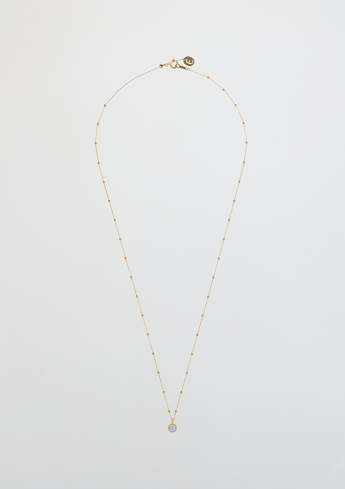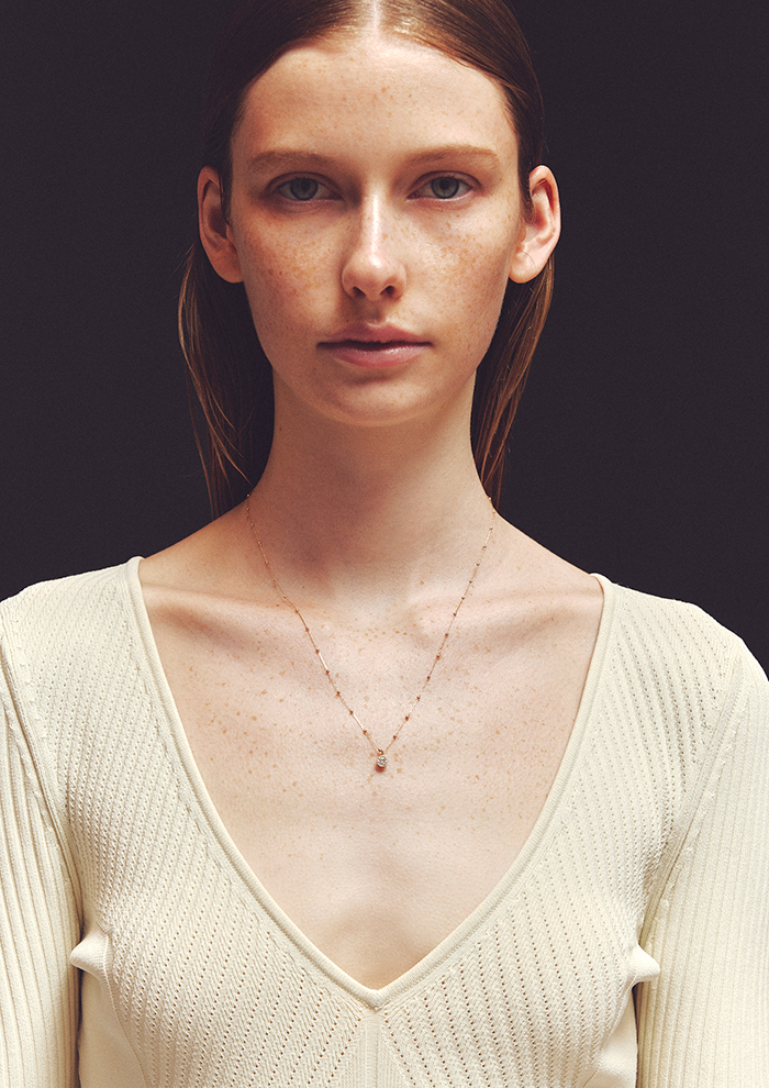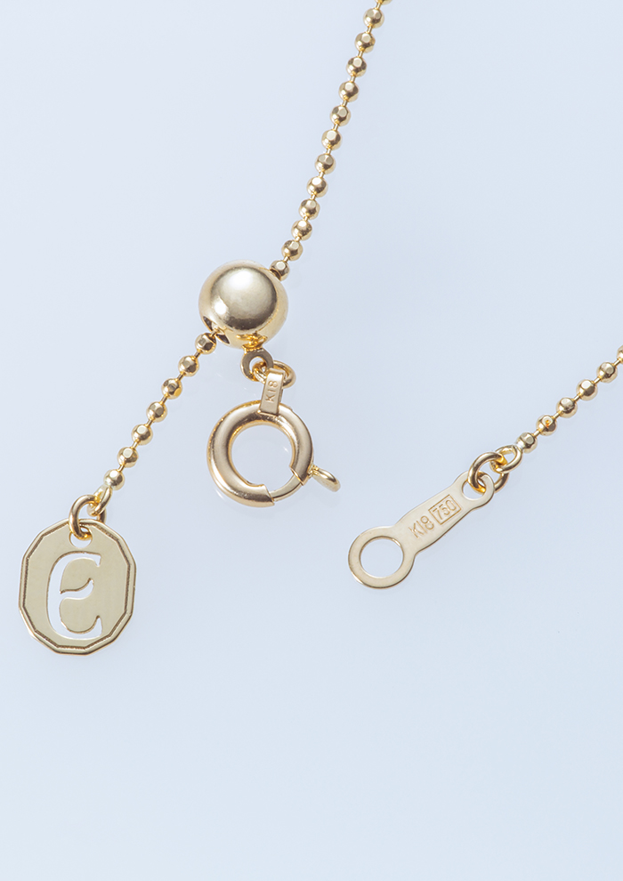 「ボールチェーンは、1本はもちろん、手持ちのゴールドチェーンやシルバーのボリュームのあるネックレスと合わせてもコーディネートに新たな表情を与えてくれます。ダイヤモンドのまわりはミル打ちを施し、「エネイ」らしいエッジをプラス。アジャスターボールで調節可能なため、チョーカーのように短くつけたり、少し長めにつけたりと、スタイルに合わせて楽しめます」。