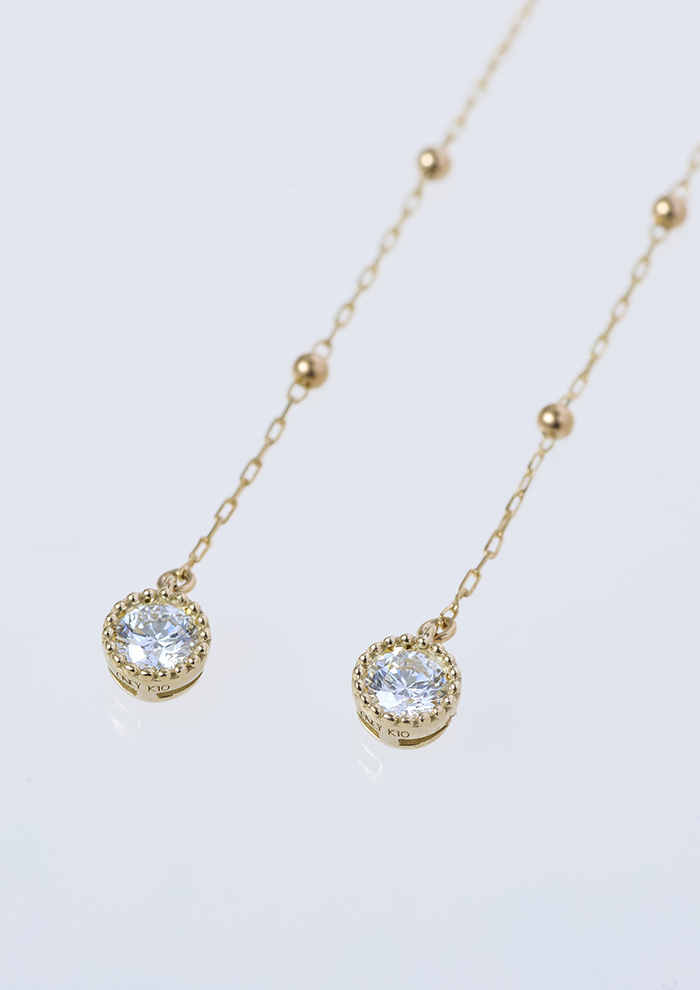 「0.1ctのラボグロウンダイヤモンドが両耳で上品にきらめくピアス。アメリカンタイプなので好みの長さで揺れ感を楽しめます。ネックレスとペアでつけると、この時期らしい華やかさと温かみのあるトータルコーディネートに。ゴールドジュエリーでも甘くなりすぎないバランスは「エネイ」ならでは」。