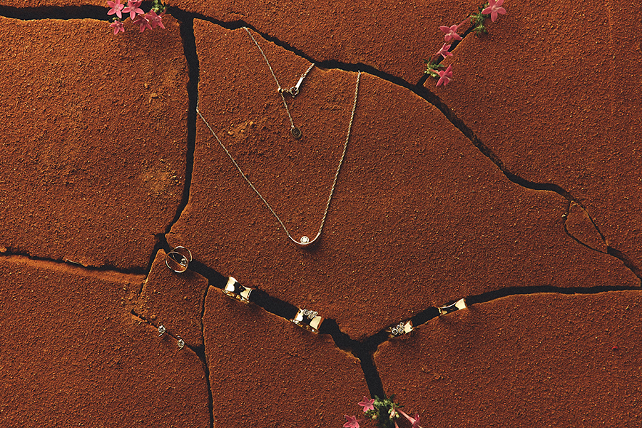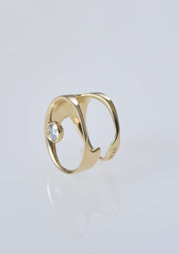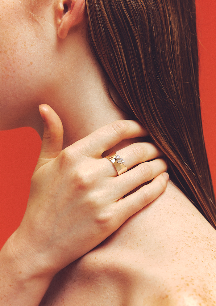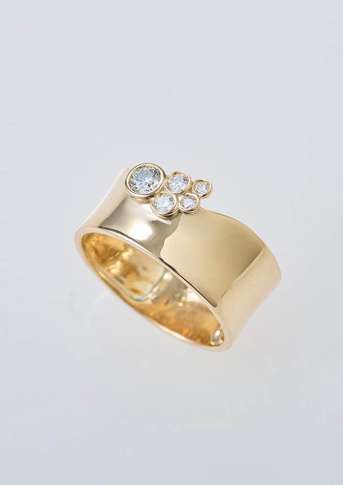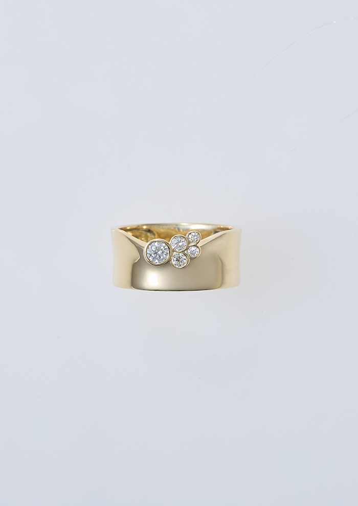 「ボリュームのあるデザインにあえて曲線を施すことで、大地・土壌の力強さと優しさを表現したリング。5つのダイヤモンドの輝きが土壌の持つエナジーと重なり、華やかさをプラスしてくれます。シンプルながらも存在感を放ち、他のリングとの相性も◎。ワイドなリングはフィット感も抜群です」。