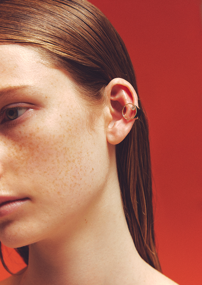 「土壌、生命の循環をイメージしたサークル型のイヤーカフは、他にはない新鮮なデザインで、同コレクションでもひと際目を引く人気アイテムです。約0.1ctのダイヤモンドを添えたデザインが個性をプラス。単体はもちろん、いつものピアスと組み合わせるのも◎。顔まわりにインパクトを添える変化球的アイテムです」。