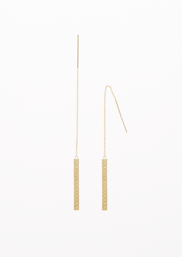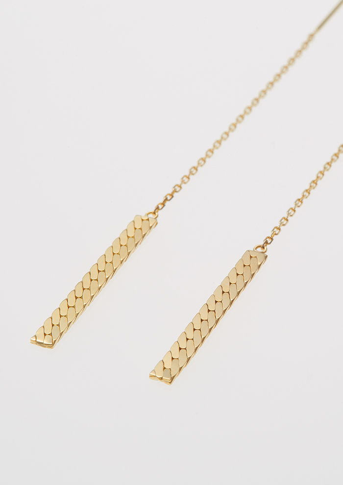 「ヘリンボーンのプレートとチェーンを繋ぎ合わせたピアスは、強さと女性らしさが感じられる逸品。プレートが縦に揺れることできらきら光が反射し、耳元を華やかにします。アメリカンピアスなので、ご自身の好みの長さでお楽しみいただけます(シリコンキャッチ付き)」。