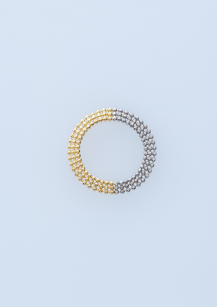 「K18イエローゴールドのボールチェーンのセンターにプラチナ850のボールチェーンを重ねたブレスレット。ボールにカットを施したチェーンの輝きが、華奢ながらさりげなく存在感を発揮します。アジャスターボールがついているので自由にサイズ調整でき、ギフトにもおすすめ」。