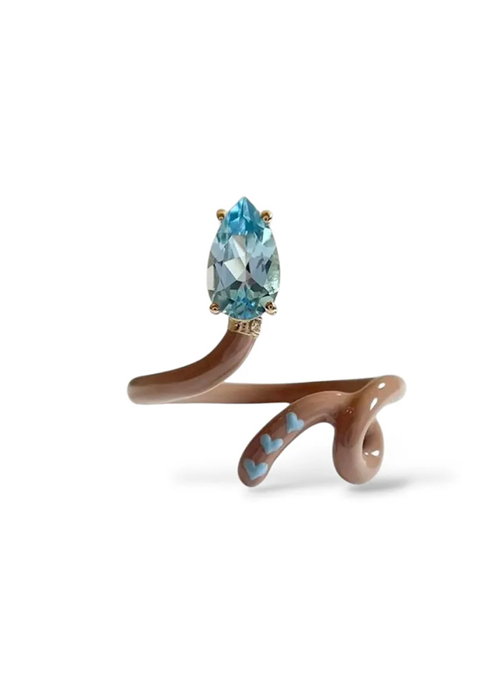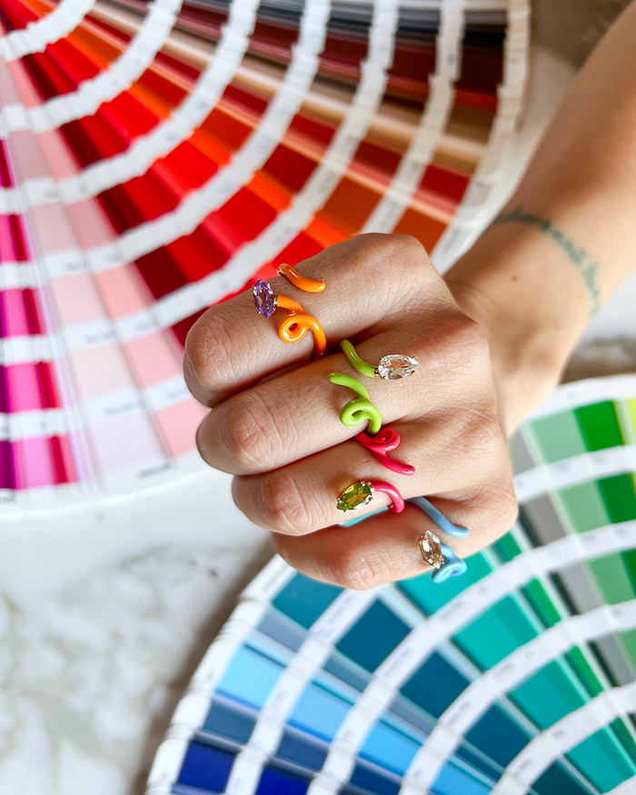 「まずは、1990年ミラノ生まれのデザイナー、ベア・ボンジャスカが立ち上げたブランドから。ポップカルチャーと現代アートからインスピレーションを得た、エナメルカラー×ゴールドの大胆で躍動感のあるジュエリーが特徴です。その唯一無二の美しさは“ミニチュアファンタジー”と称され、数々の賞を受賞。2020年には「デビアス」グループから注目デザイナーに選出されるなど、世界中のミレニアル世代から支持を集めています。鮮やかな色彩と有機的な曲線が描く“ジュエリーアート”は、見るたびに心が弾む存在。手描きエナメルの温度感と遊び心がスタイルの鮮度を上げてくれます」。