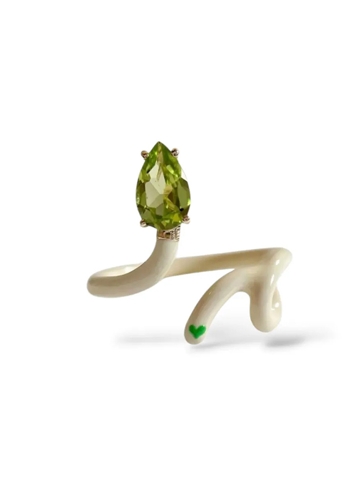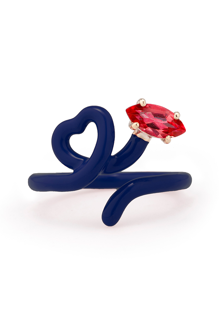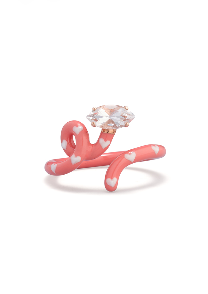 「「アッシュ・ペー・フランス」のためにカスタマイズされたリング。ブランドのアイコンともいえる、鮮やかなエナメルカラーによる有機的な曲線は、ミラノのスタジオでひとつひとつ手描きで仕上げられたもの。モチーフは、シックであり、ジュエリーにおいて最も普遍的に愛され続けてきたハート。ブランドの最新コレクションでも、ハートは「愛」や「つながり」、そして「時をこえる感情」の象徴として重要なテーマとなっています。クリーンなカラーが凛とした存在感を放つ限定リング。エナメルの美しい発色が肌を明るく見せ、ミニマルなスタイルにアクセントをプラスします」。