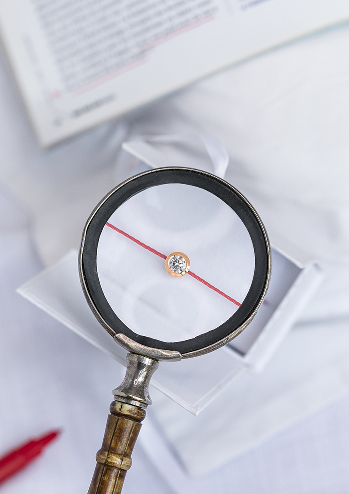 「デザイナーは、フランス在住のレティシア・コーエンスカリ。古くからさまざまな民族や文明において幸福のお守りとされる“エルサレムの赤い紐”からインスピレーションを得て、2005年に本格的に自身のブランド「レッドライン」をスタートしました。すべてのジュエリーについている“K”のサインは古代エジプトで、平和、穏やかさ、静けさ、調和などの象徴。ダイヤモンドや18金のチェーンなどと組み合わせたミニマムなデザインが、幸運のお守りとして人々に愛されています」。