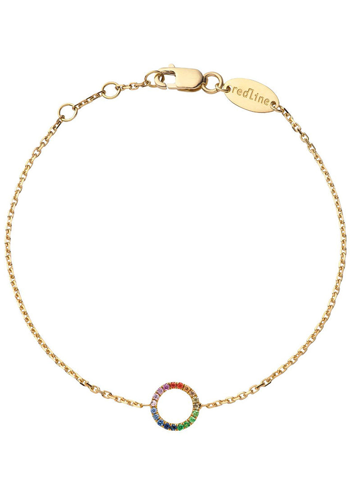 「19石の小さなカラーサファイアがマルチカラーのグラデーションを描く“オーラ レインボーカラーブレスレット”。幸運の前触れでもある虹を彷彿させるデザインには、強運が宿ること間違いなし! 虹を思わせる色彩が、日常のスタイルに希望と明るさをもたらします」。