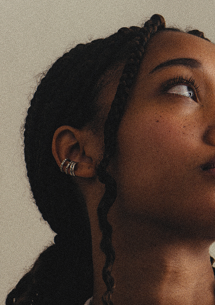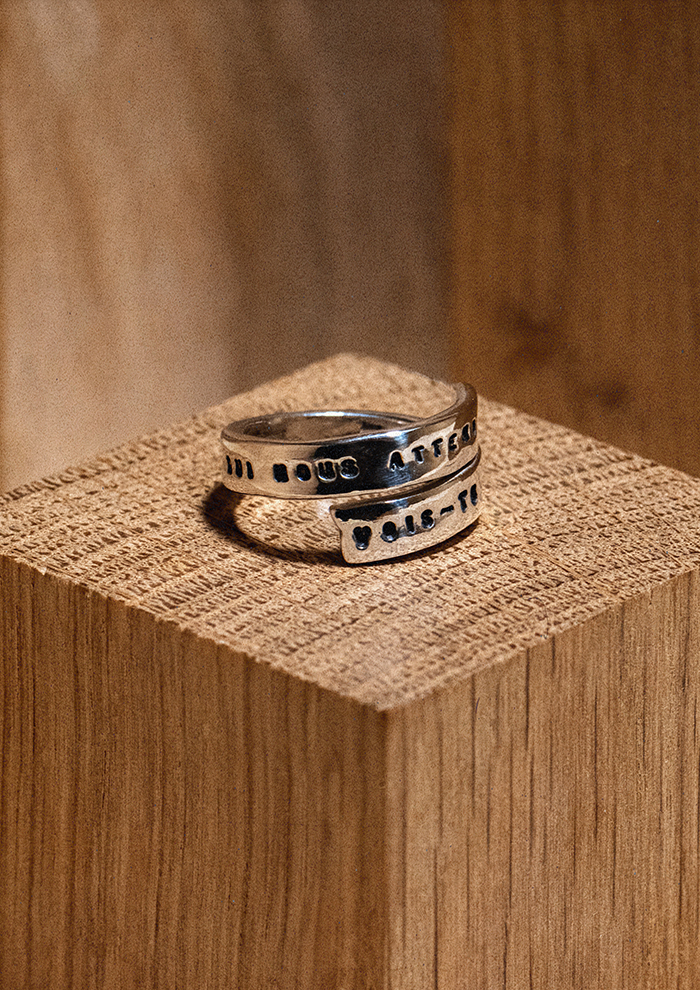 「“座って空を見上げて”というメッセージを刻むリング。日々にそっと寄り添い、心に余白をくれるような詩的な存在感です」。
