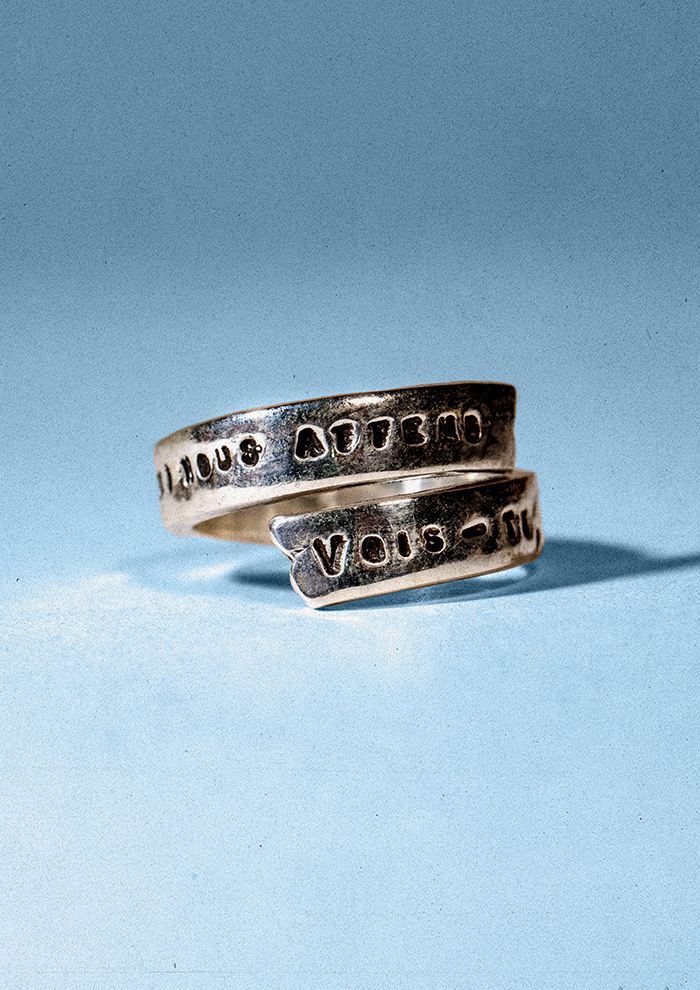 「“素晴らしい時と幸せが私たちを待っている”という言葉を刻んだリング。温かみのある風合いとほどよい存在感で、前向きな気持ちをそっと支えます」。