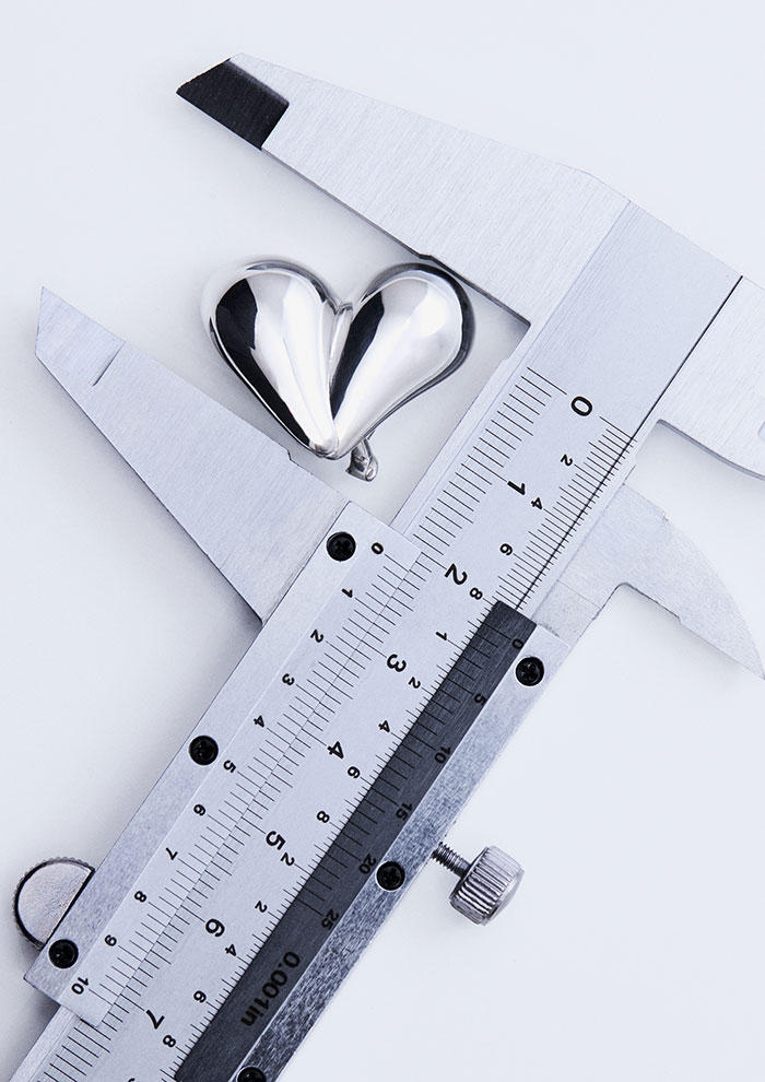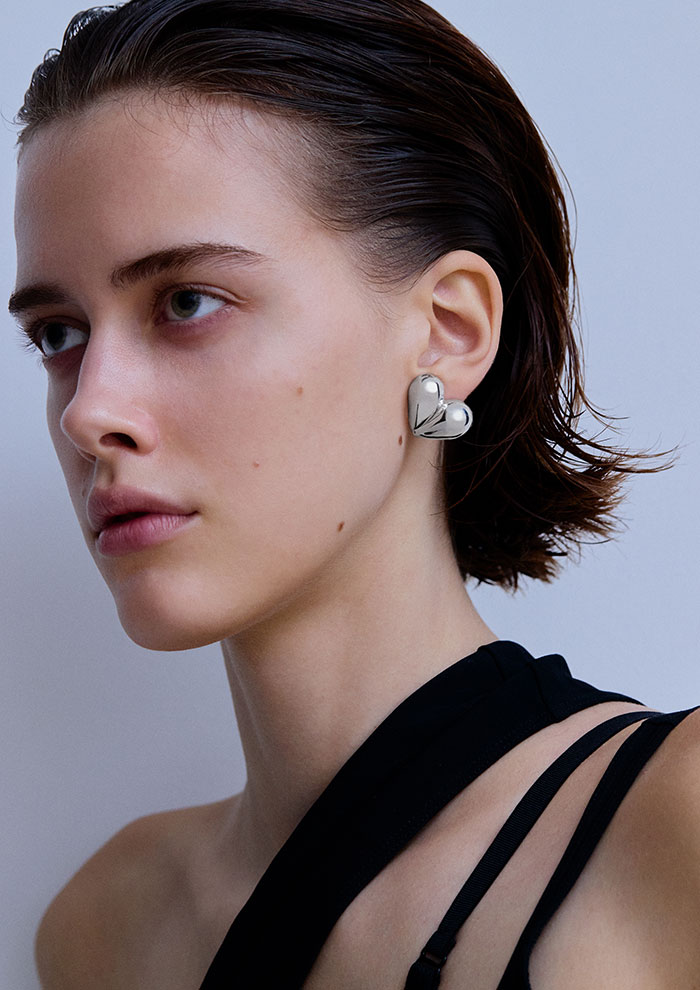 「ぷっくりとしたフォルムと大ぶりのデザインが目を引くハートイヤリングは、中空構造でとても軽やかなつけ心地。少し傾くように着用するため、甘さを抑えたハートモチーフが大人の女性に映えます」。