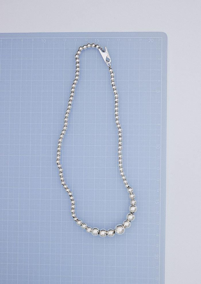 「こちらは、サイズの異なるボールチェーンを組み合わせたネックレス。センター部分をアシンメトリーにすることで、カジュアルなボールチェーンに洗練されたニュアンスを加えています」。