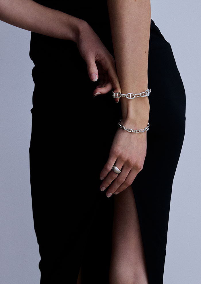 「留め具のデザインが印象的なマリーナチェーンブレスレット。ボリューム感のあるチェーンが手元に存在感をプラスします。細いチェーンと太いチェーンの2種類をご用意。お好みのバランスでチョイスして」。
