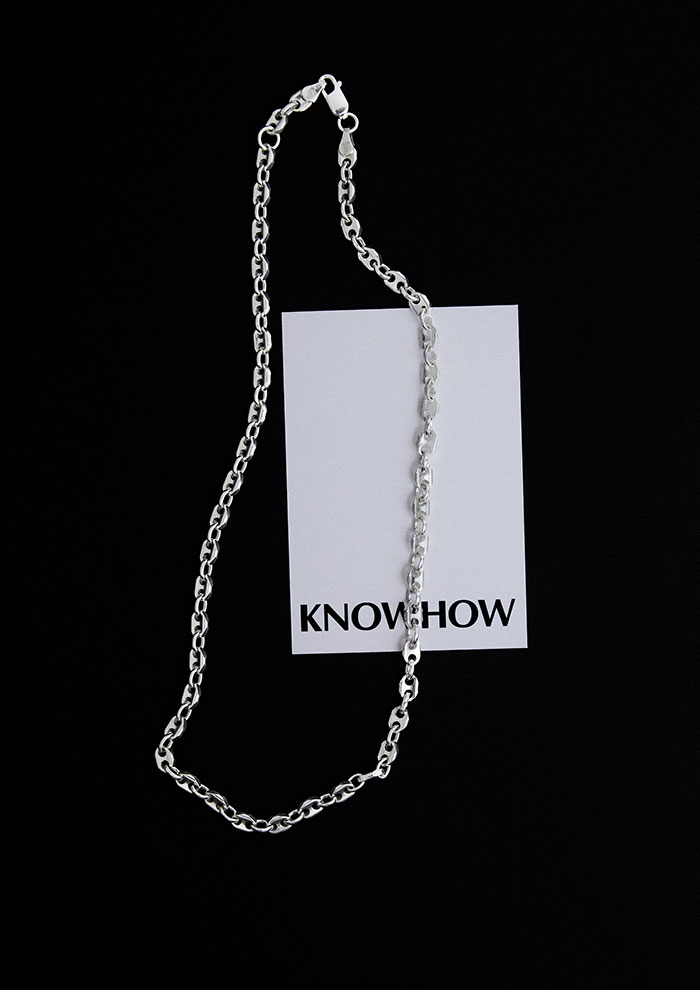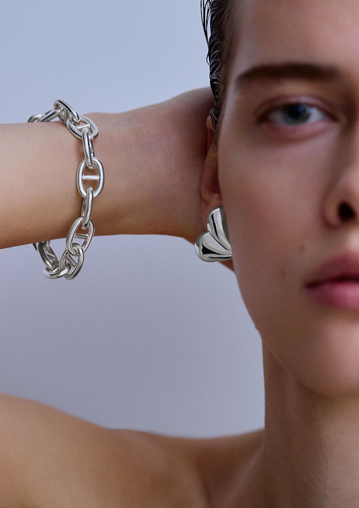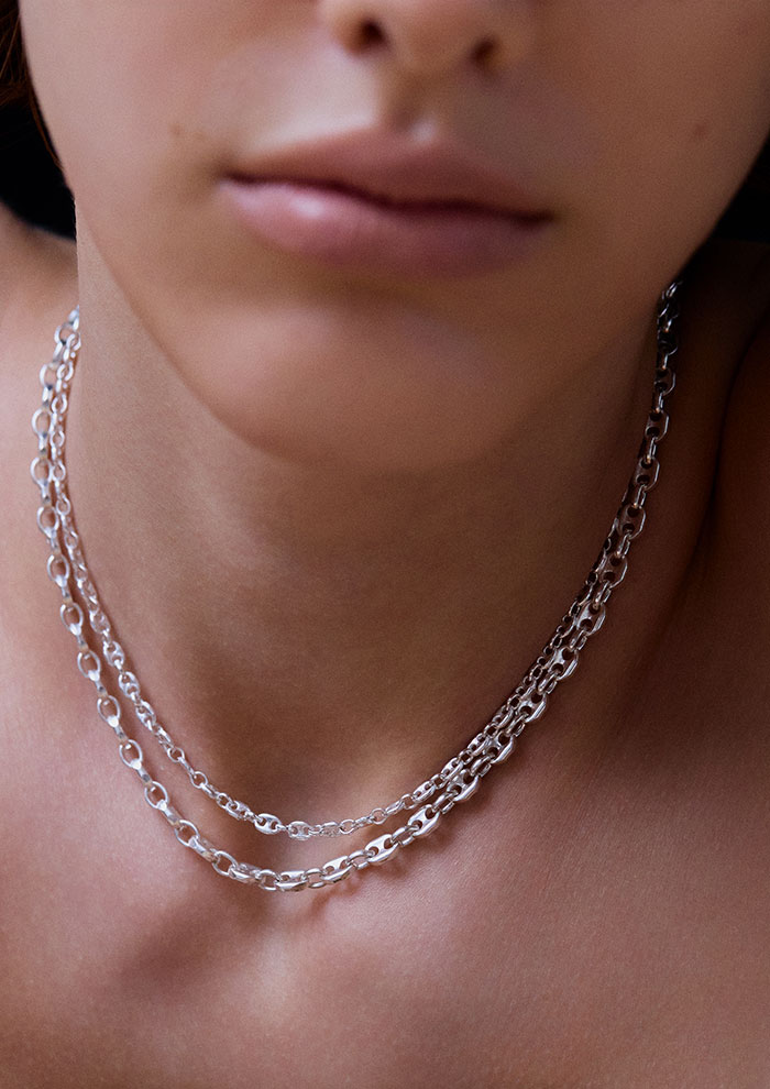 「モードな雰囲気のチェーンネックレスは、肌なじみの良い華奢なチェーンと、存在感のある太めのチェーンの2タイプをご用意。どちらも幅広いスタイリングに寄り添い、コーディネートを品よく引き締めます」。