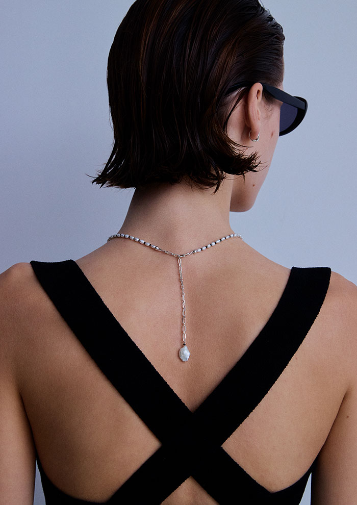 「華奢なパールとブラックのガラスビーズを組み合わせた、上品な佇まいのネックレス。エンドにあしらったパールがバックスタイルまで上品に引き立てます。コードネックレスとの重ねづけも相性抜群」。
