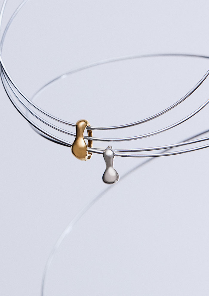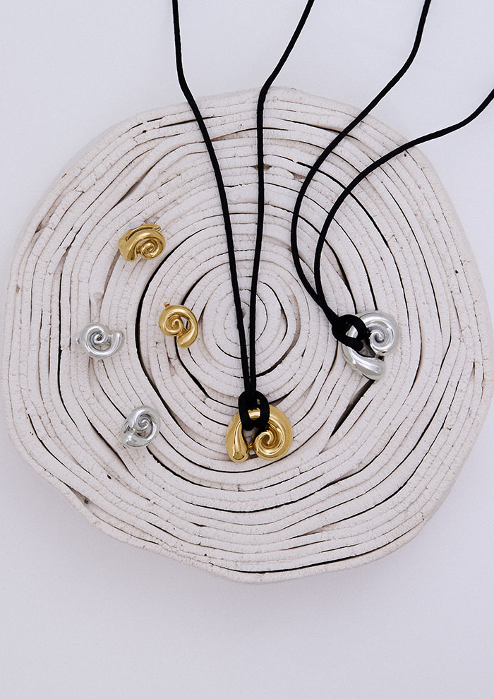 「渦をモチーフにした新シリーズ。存在感のあるチョーカーは、ブラックのコードが首元をすっきりと引き締めて見せてくれます。同シリーズのイヤーカフは、うずまきのような立体的フォルムが耳元で存在感を発揮。クリップ仕様のため、耳たぶから軟骨までさまざまな位置にフィットし、気分に合わせてスタイリングが楽しめます」。