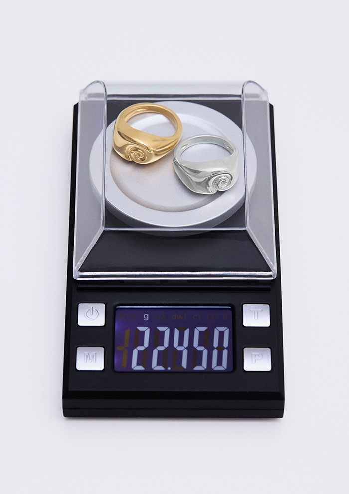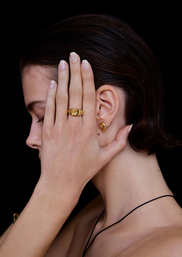 「うずまきモチーフの立体的デザインが印象を残すリング。ほどよい高さとボリュームが指元に存在感を与えます」。