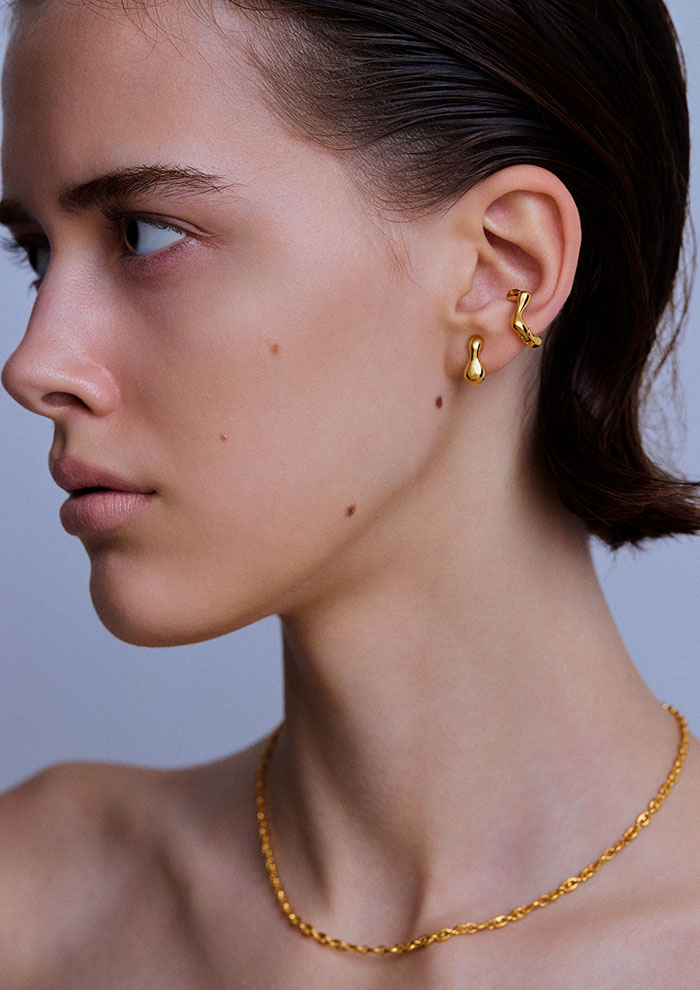 「くびれのある有機的なフォルムが魅力のイヤーカフ。ほどよいボリュームでデイリーに活躍します。クリップ仕様のため、耳たぶや軟骨などお好みの位置で楽しんで」。