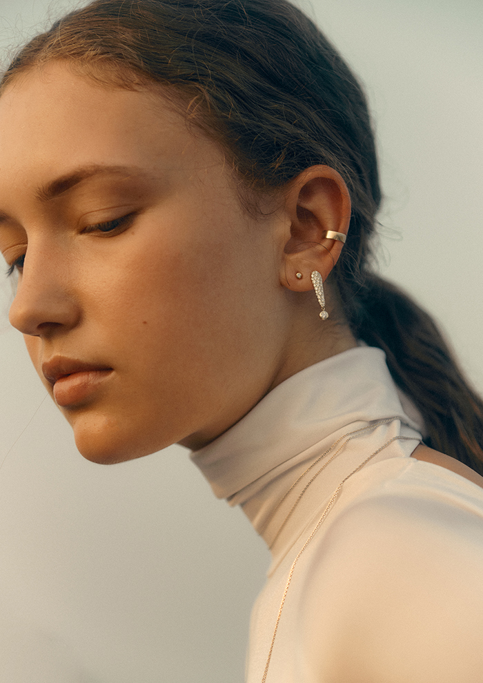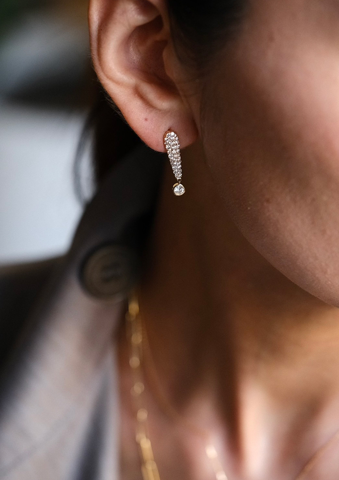 「スタイルにひとさじのスパイスをプラスしてくれる、パヴェダイヤモンドのエクスクラメーションピアス。零れ落ちるひと粒のドロップが、動くたびに小さく揺れて存在感を放ちます。胸の内にある好奇心を刺激する、そんな大人の“遊び”を楽しめるアイテム」。